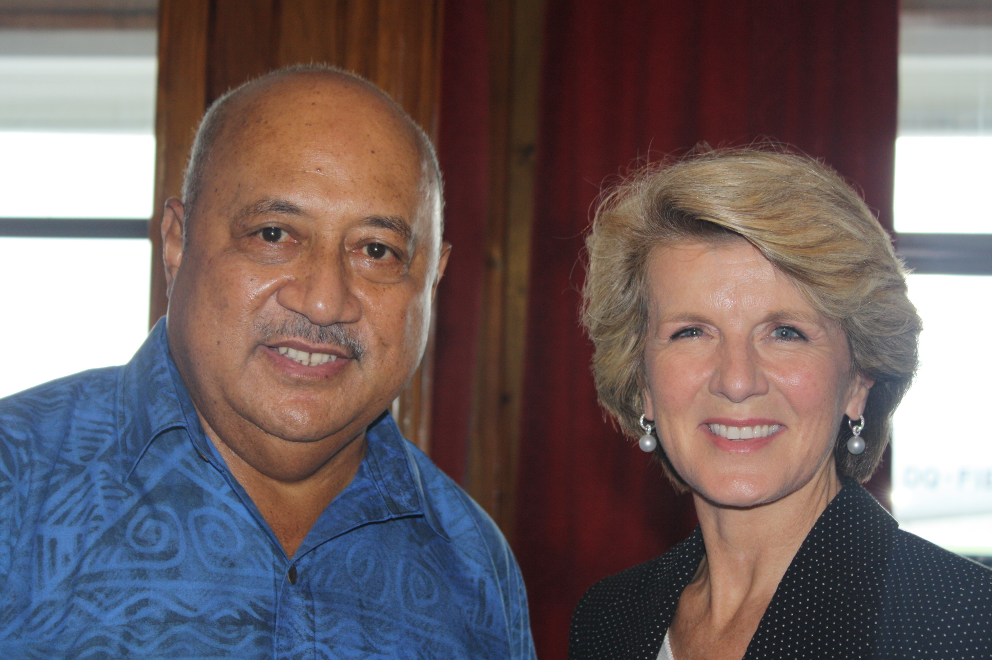 Minister Bishop is greeted by Ratu Inoke Kubuabola, Fiji Minister of Foreign Affairs, upon her arrival at Nausori Airport, Suva for the two-day Pacific Islands Forum Ministerial Contact Group (MCG) visit. Photo: DFAT. Friday, 14 February 2014.