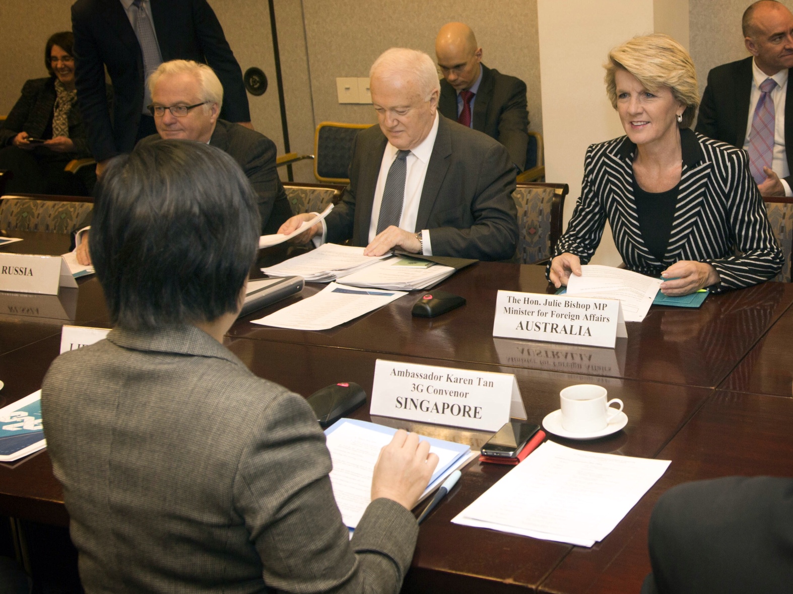 Foreign Minister, Julie Bishop, briefing members of the Global Governance Group on Australia's G20 priorities at the Permanent Mission of Singapore to the UN. To her right are Amb Gary Quinlan and Amb Vitaly Churkin (Russia).