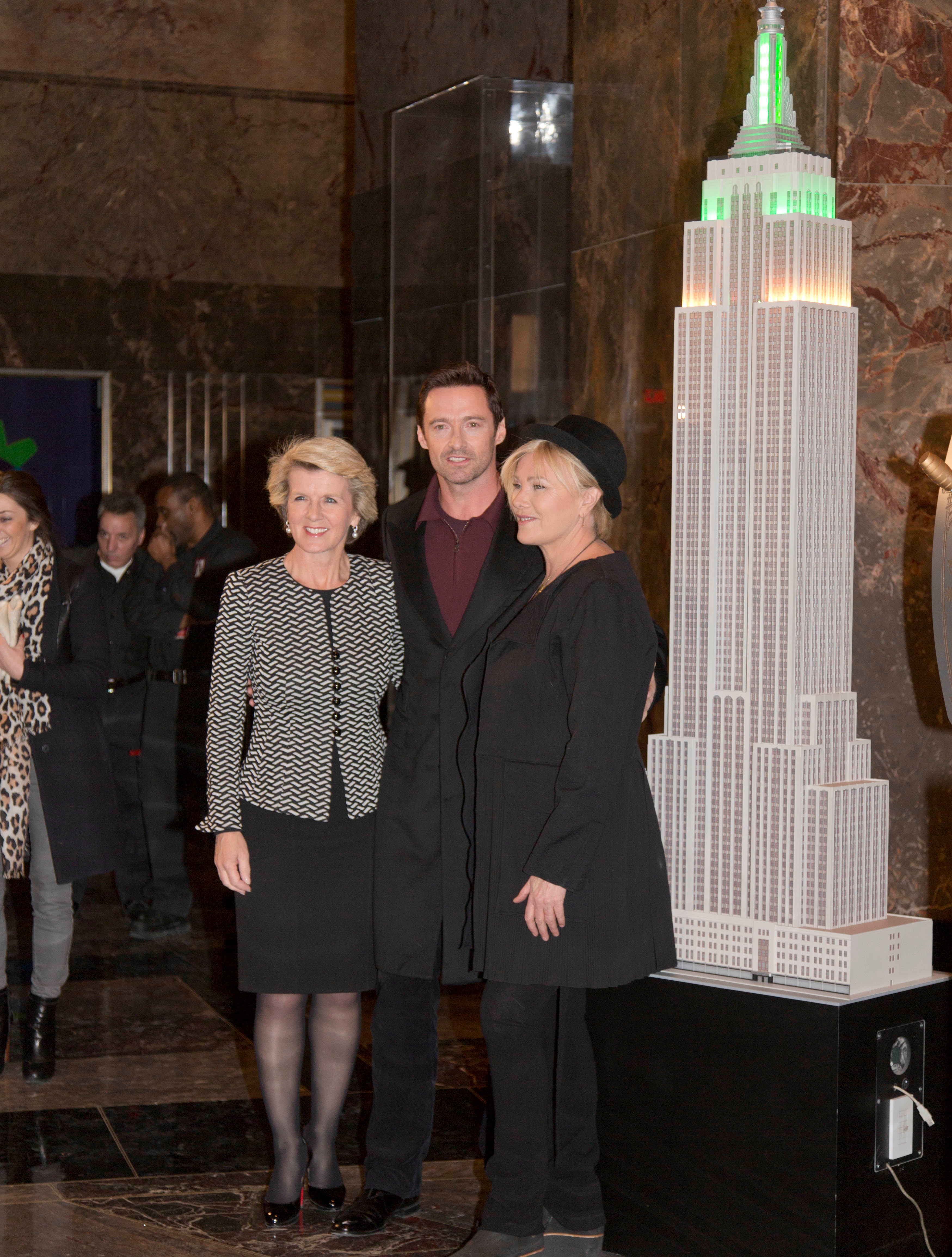 Foreign Minister Julie Bishop, Hugh Jackman and Deborra-lee Furness flip the switch to turn the Empire State Building green and gold for Australia Day. 24 January 2014.