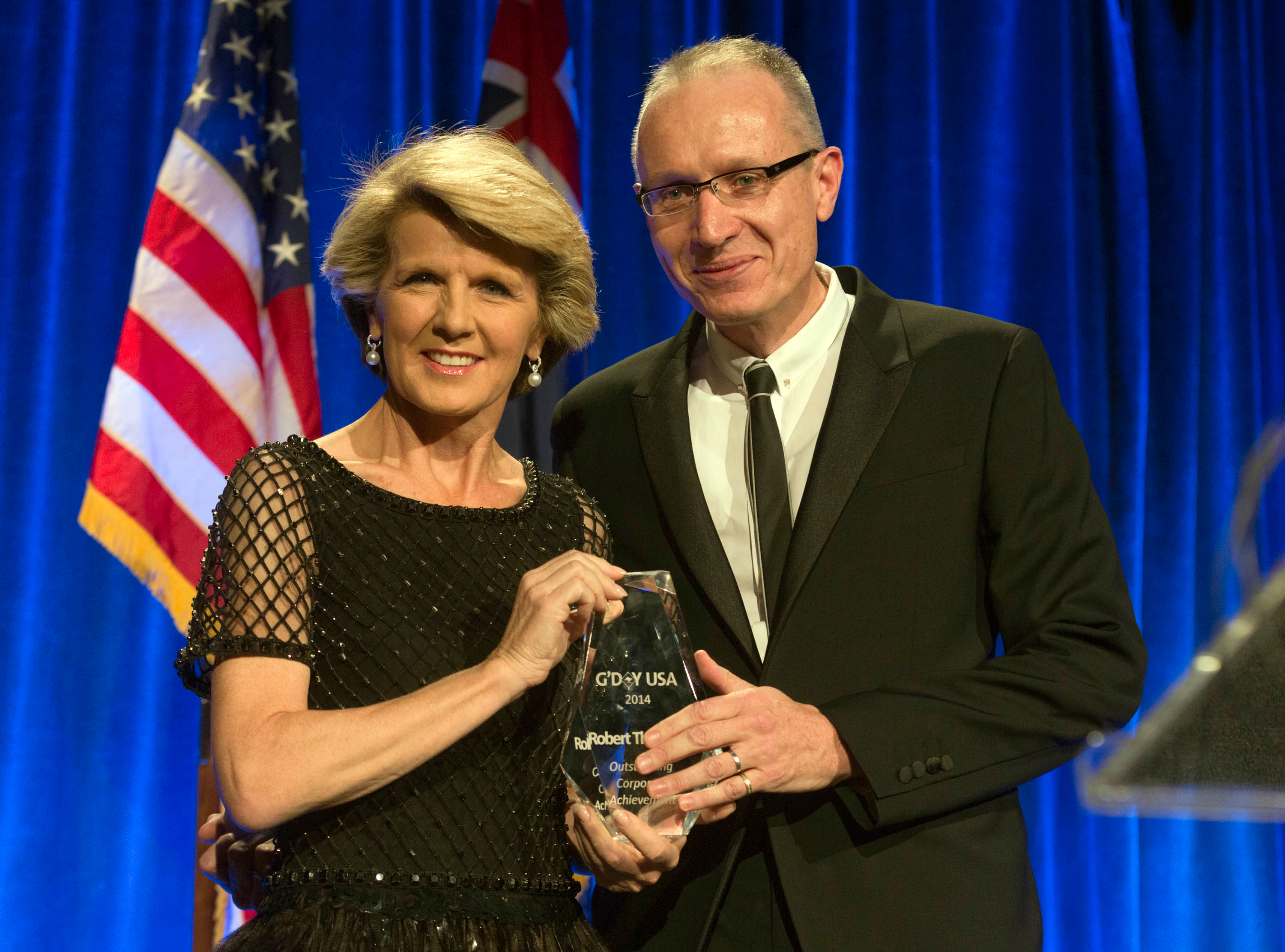 Foreign Minister Julie Bishop with Robert Thomson, CEO of News Corporation, who was honoured for lifetime achievement in business at the G'Day USA Dinner in New York. 24 January 2014.