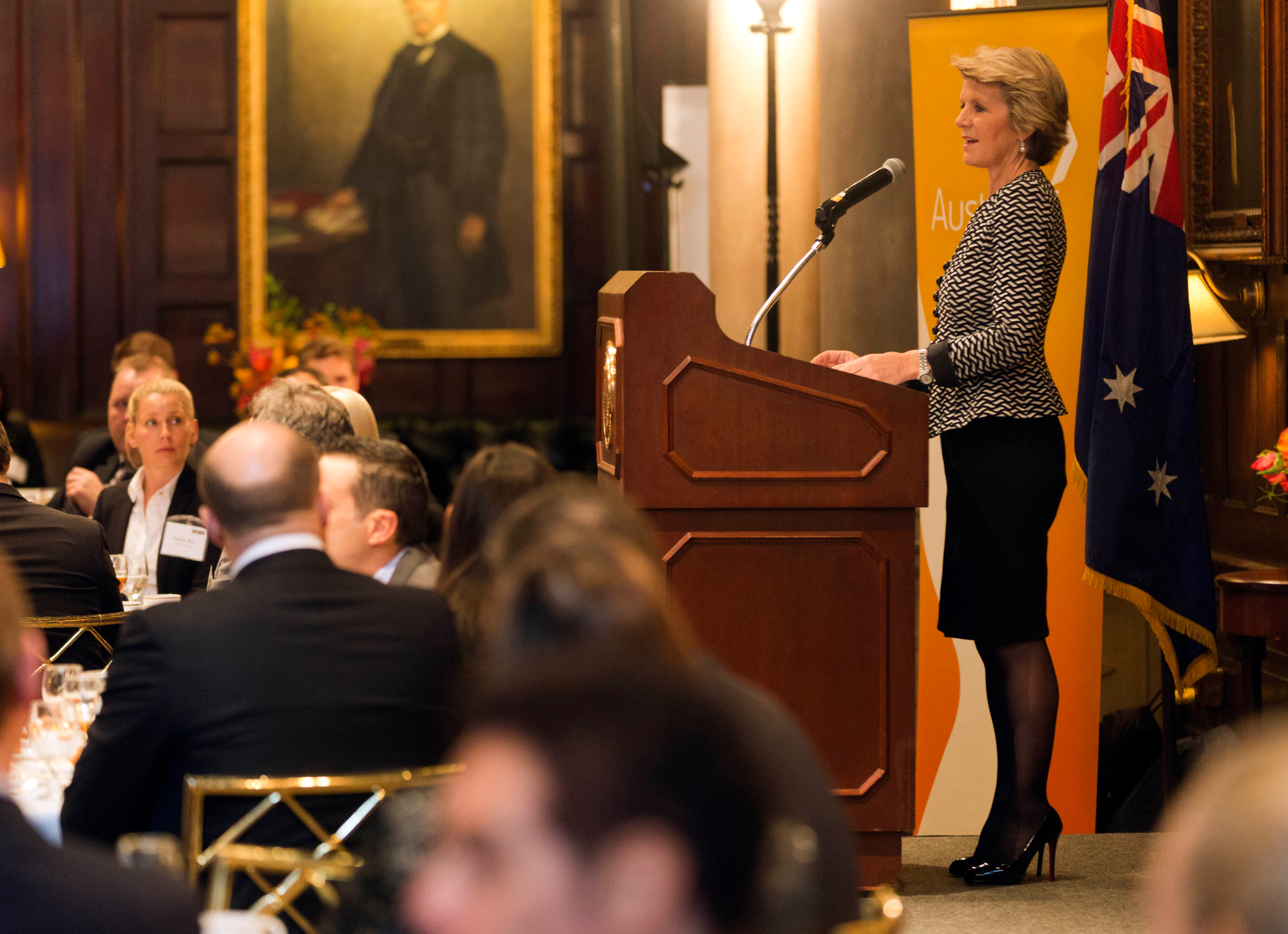 Foreign Minister Julie Bishop delivers the keynote address at the Australian Outlook Luncheon at the Harvard Club of New York. 24 January 2014.