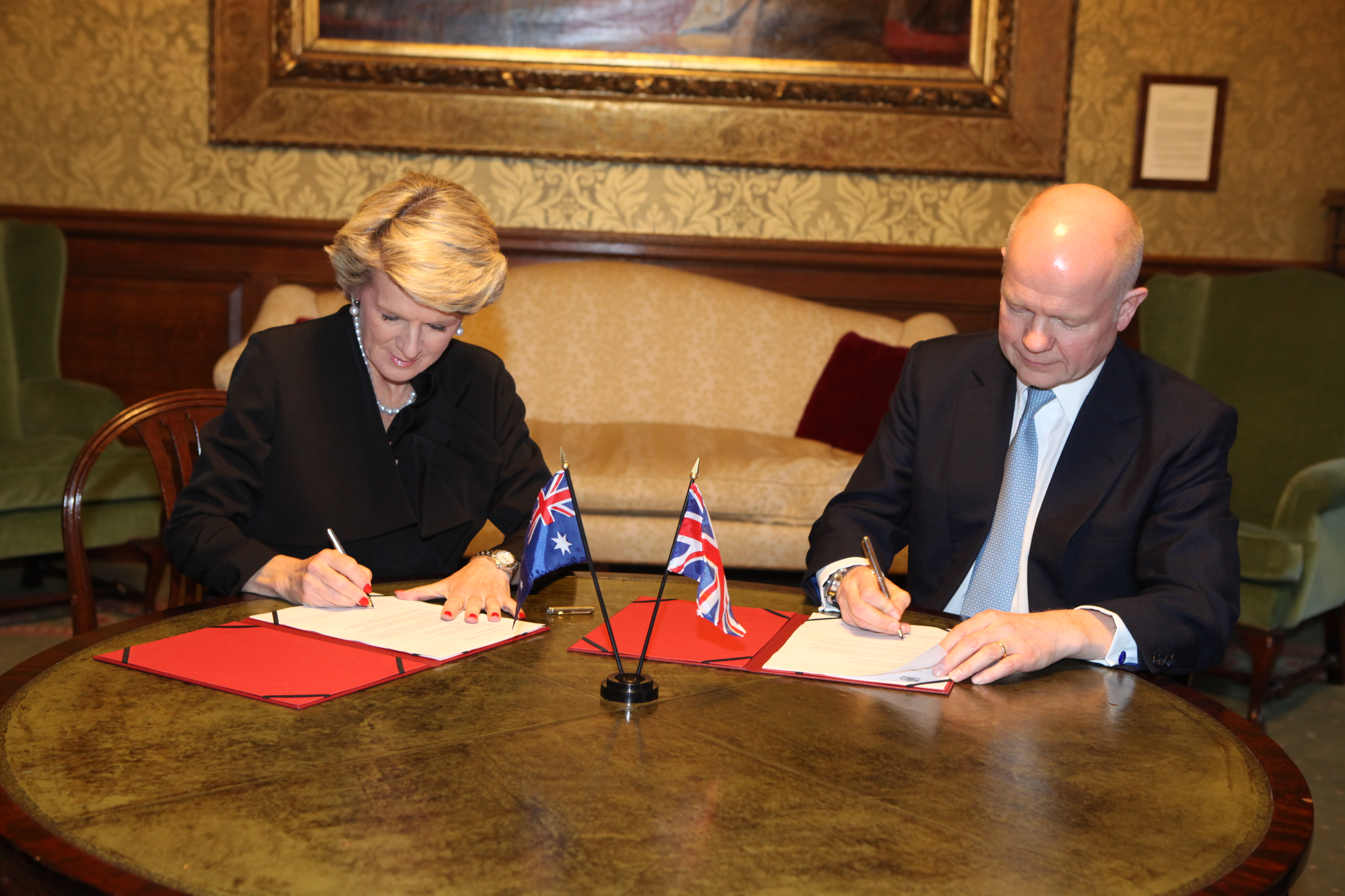 Australian Foreign Minister Julie Bishop and UK Foreign Secretary William Hague signing the joint statement between the UK and Australia on enhanced diplomatic network cooperation. 10 March, 2014.