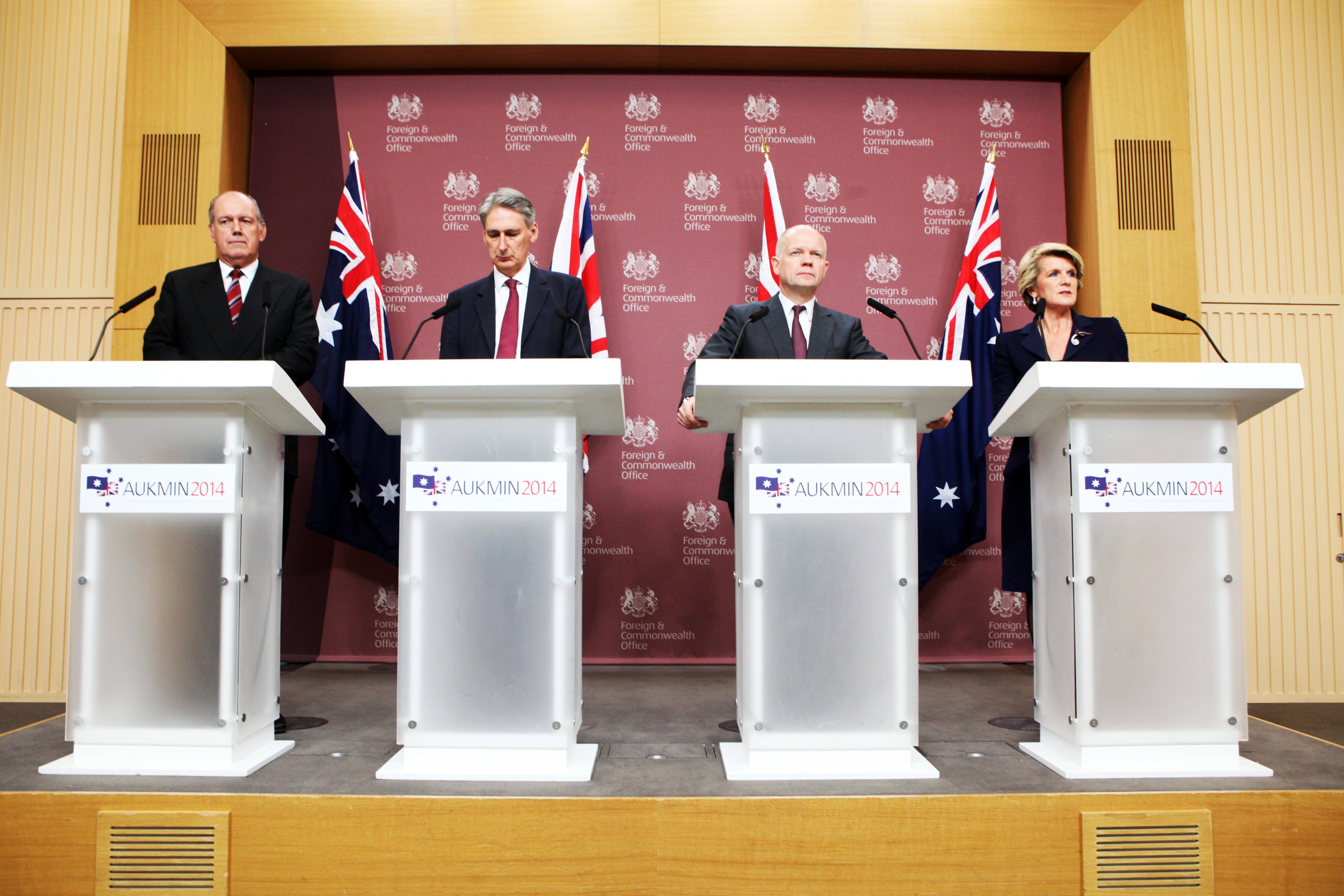 AUKMIN press conference held at the Foreign & Commonwealth Office in London with Australian Defence Minister David Johnston, UK Defence Secretary Minister Philip Hammond, UK Foreign Secretary William Hague and Australian Foreign Minister Julie Bishop. 11 March, 2014.