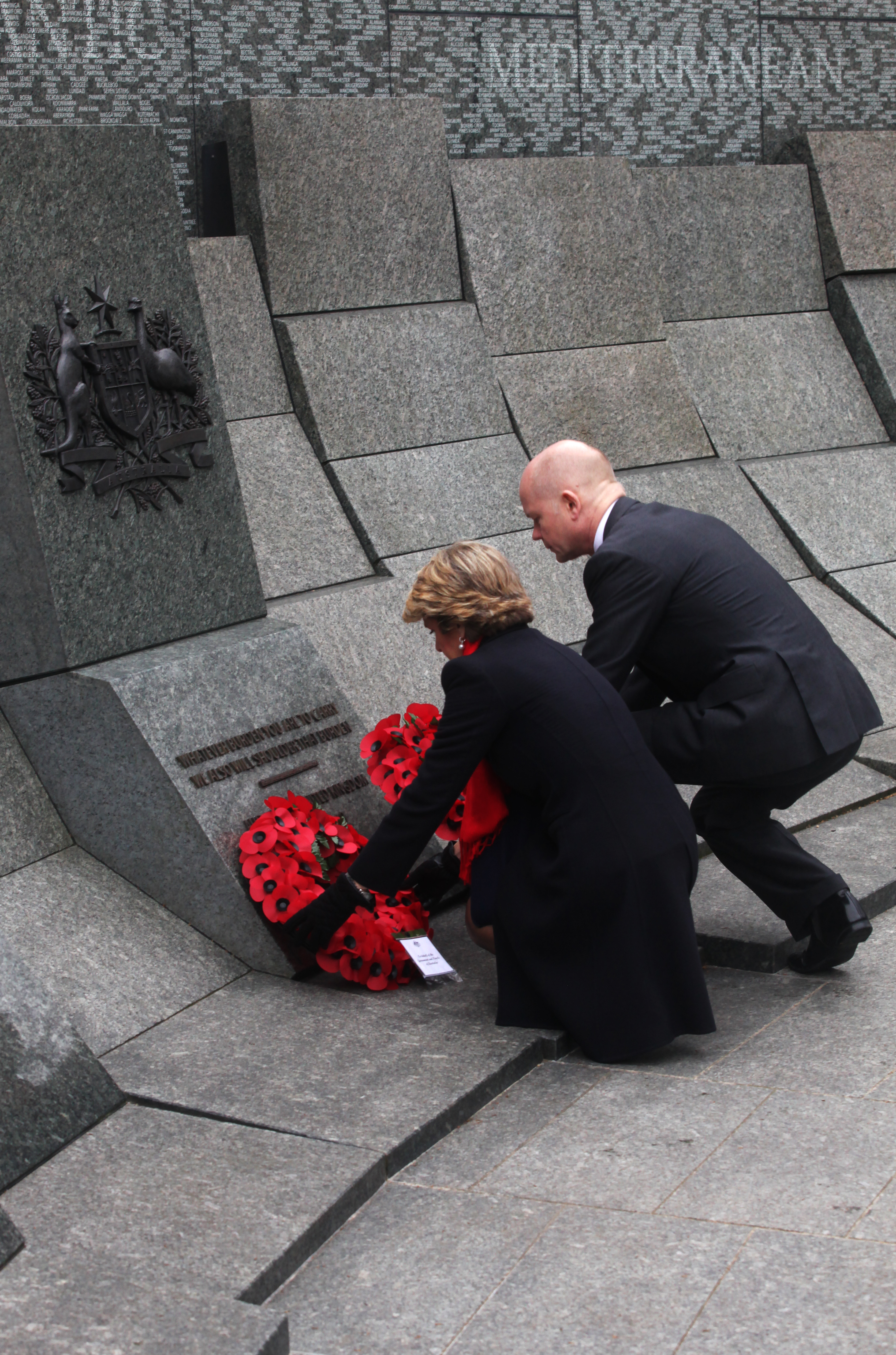Minister Julie Bishop and UK Foreign Secretary William Hague laying wreaths at the Australian War Memorial, Hyde Park Corner, London, on 11 March 2014, during AUKMIN.