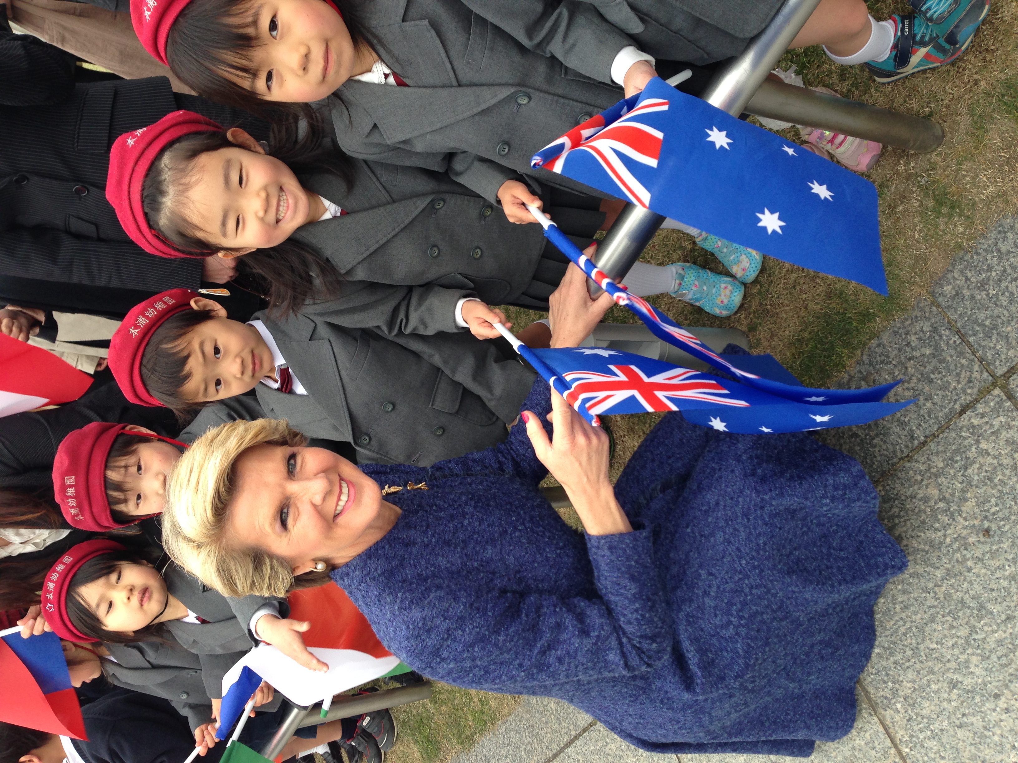 Foreign Minister Julie Bishop is greeted by students at the Cenotaph memorial for A-bomb victims in Hiroshima.