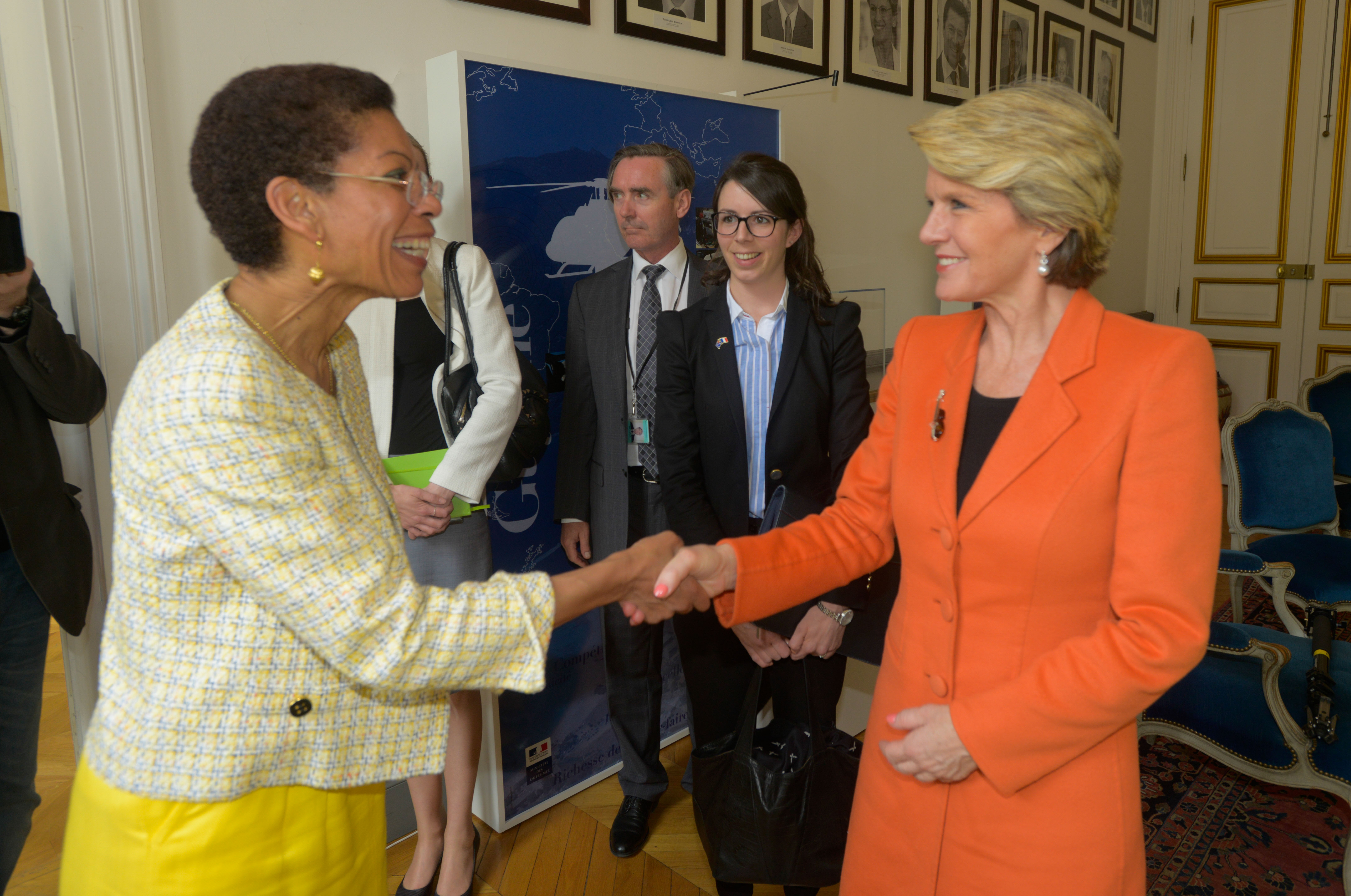 The Hon Julie Bishop MP, Foreign Minister of Australia, meets French Minister for Overseas Territories, Ms George Pau-Landevin, in Paris on 23 April 2014.