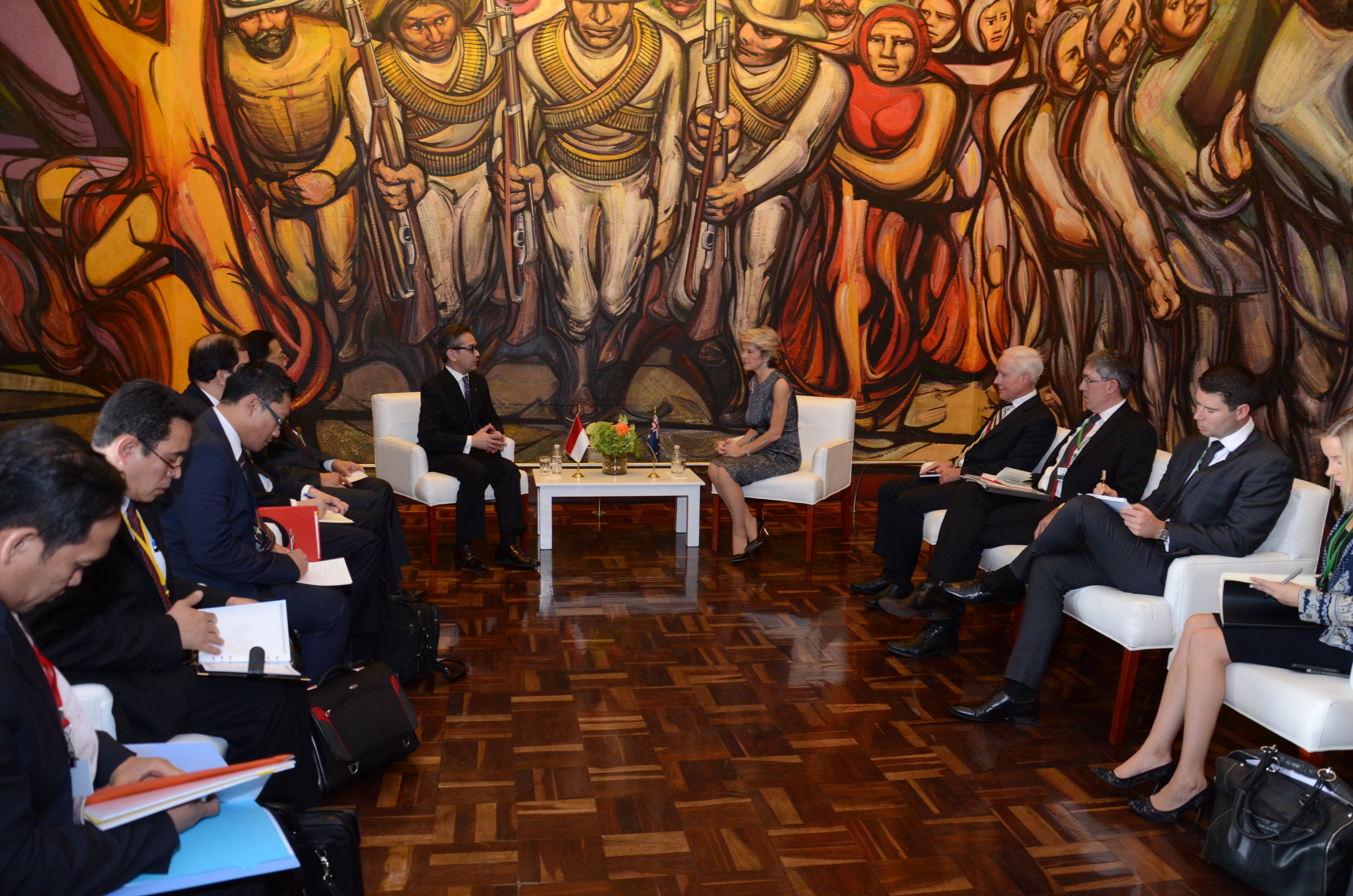 The Minister for Foreign Affairs of Australia, The Hon Julie Bishop MP, and the Minister for Foreign Affairs of Indonesia, Marty Natalegawa, during a bilateral meeting in the margins of the MIKTA Foreign Ministers Retreat in Mexico City. 14 April 2014.