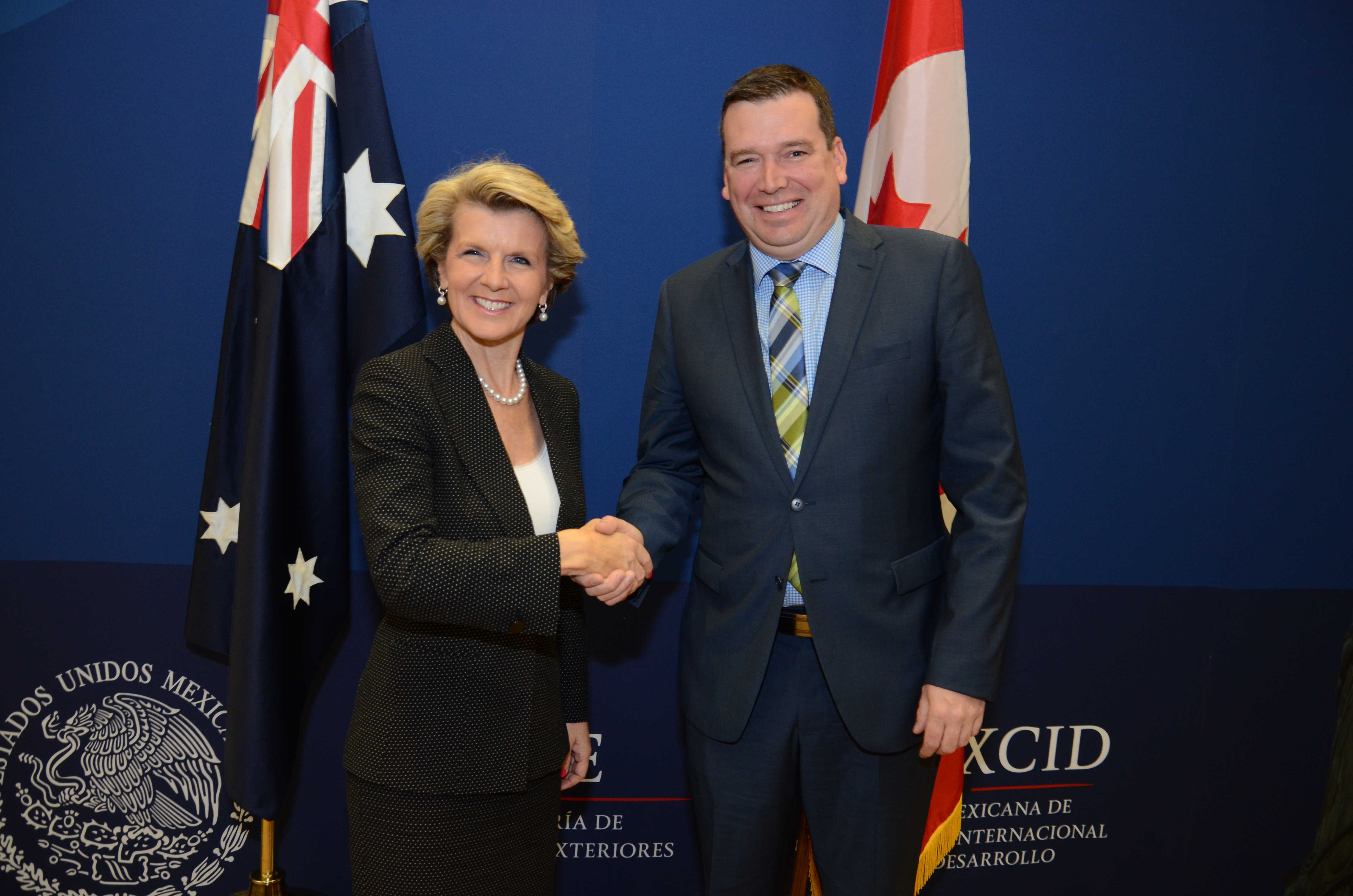 The Minister for Foreign Affairs of Australia, The Hon Julie Bishop MP and the Minister for International Development of Canada, The Hon Christian Paradis, during a bilateral meeting in the margins of the First High-Level Meeting of the Global Partnership for Development Cooperation in Mexico City. 16 April 2014.