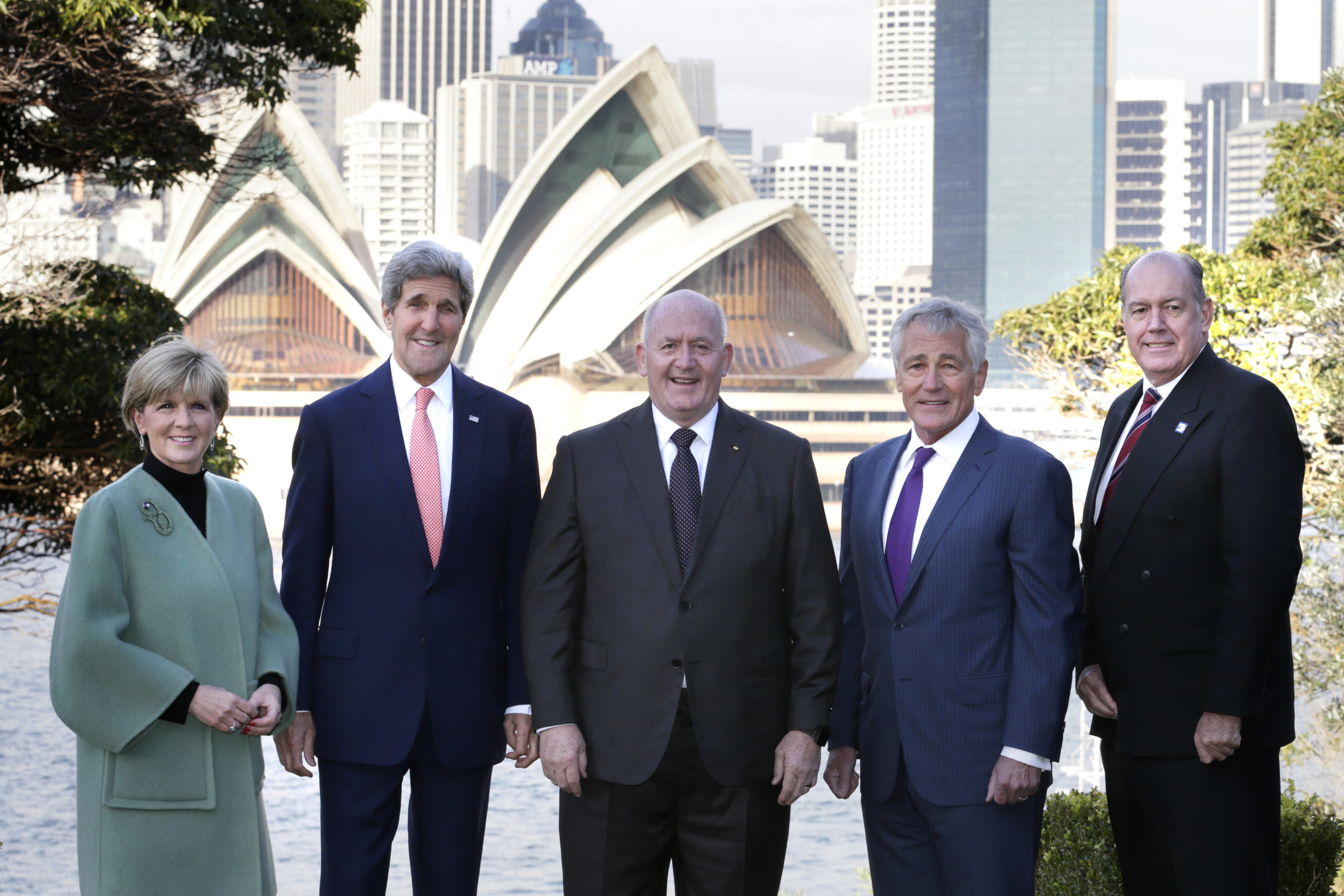 Minister for Foreign Affairs, Julie Bishop, United States Secretary of State, John Kerry, Governor General of Australia, Sir Peter Cosgrove, United States Secretary of Defense, Chuck Hagel and Minister for Defence, David Johnston ahead of the signing of the Force Posture Agreement during the Australia-United States Ministerial Consultations (AUSMIN) 2014 at Admiralty House in Sydney. 12 August 2014.