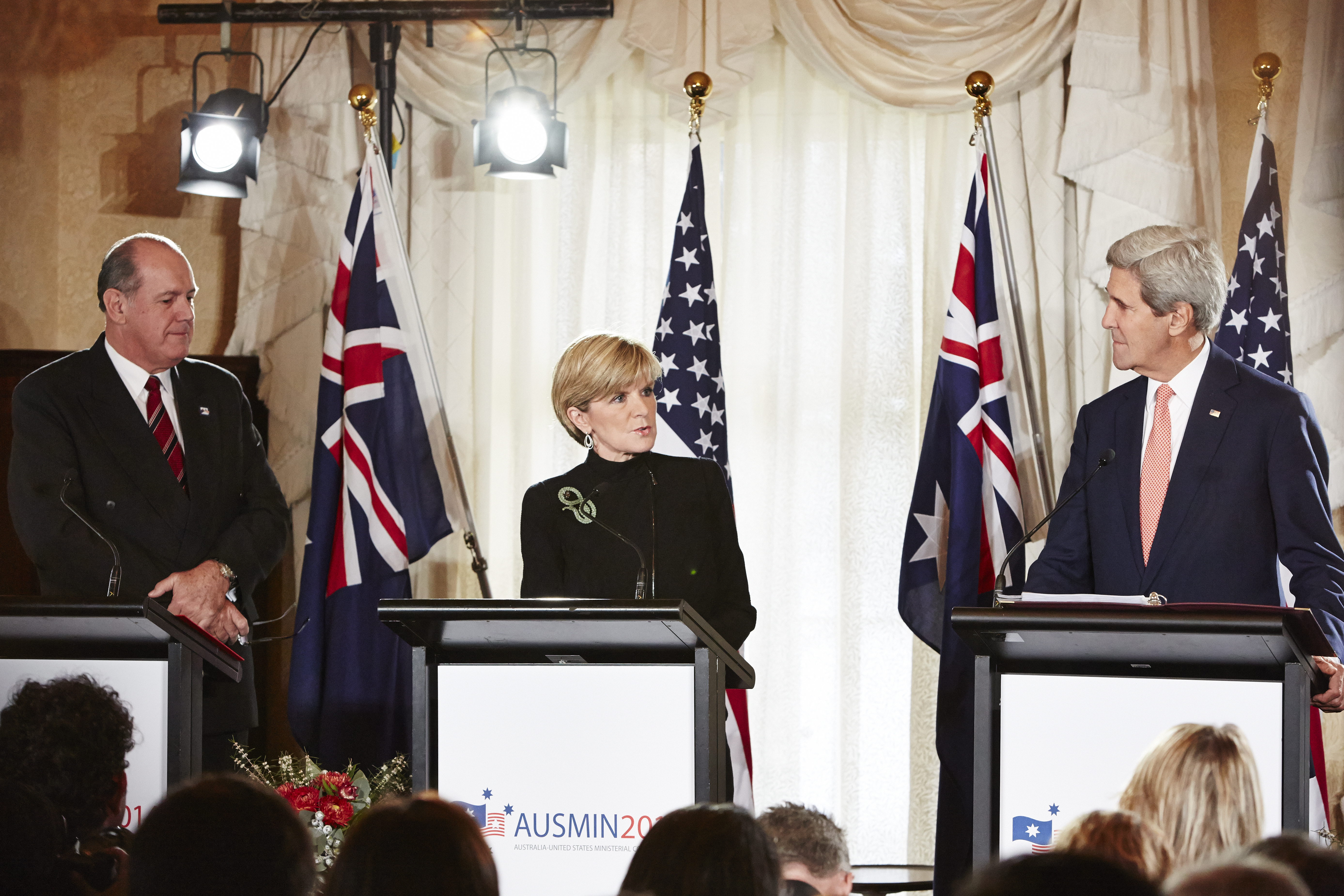 Minister for Foreign Affairs, Julie Bishop speaks to the media with Minister for Defence, David Johnston and United States Secretary of State, John Kerry at the Australia-United States Ministerial Consultations (AUSMIN) 2014 at Admiralty House in Sydney. 12 August 2014.