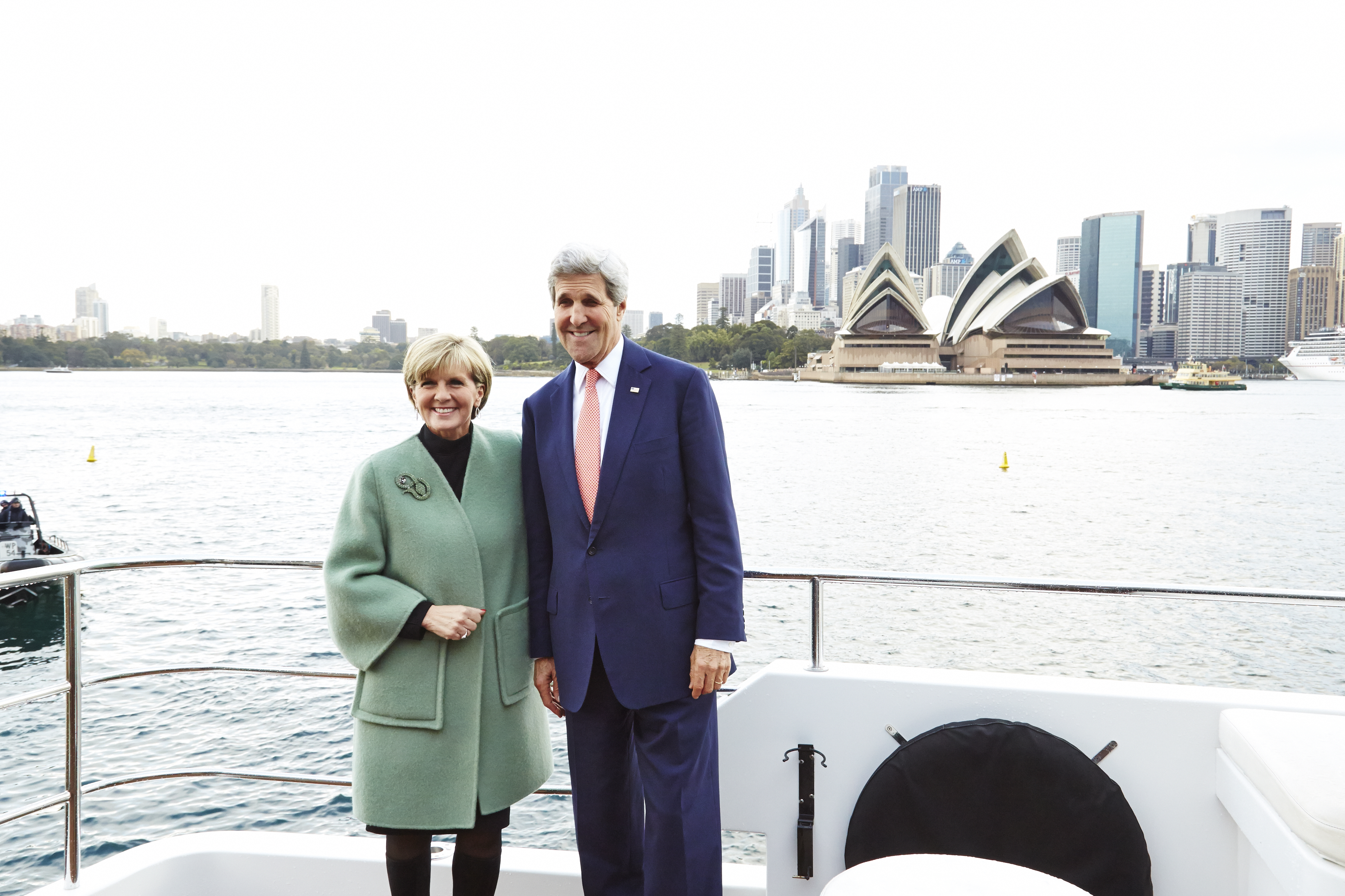 Minister for Foreign Affairs, Julie Bishop and United States Secretary of State, John Kerry travelling to the opening of the Australia-United States Ministerial Consultations (AUSMIN) 2014 at Admiralty House in Sydney. 12 August 2014.