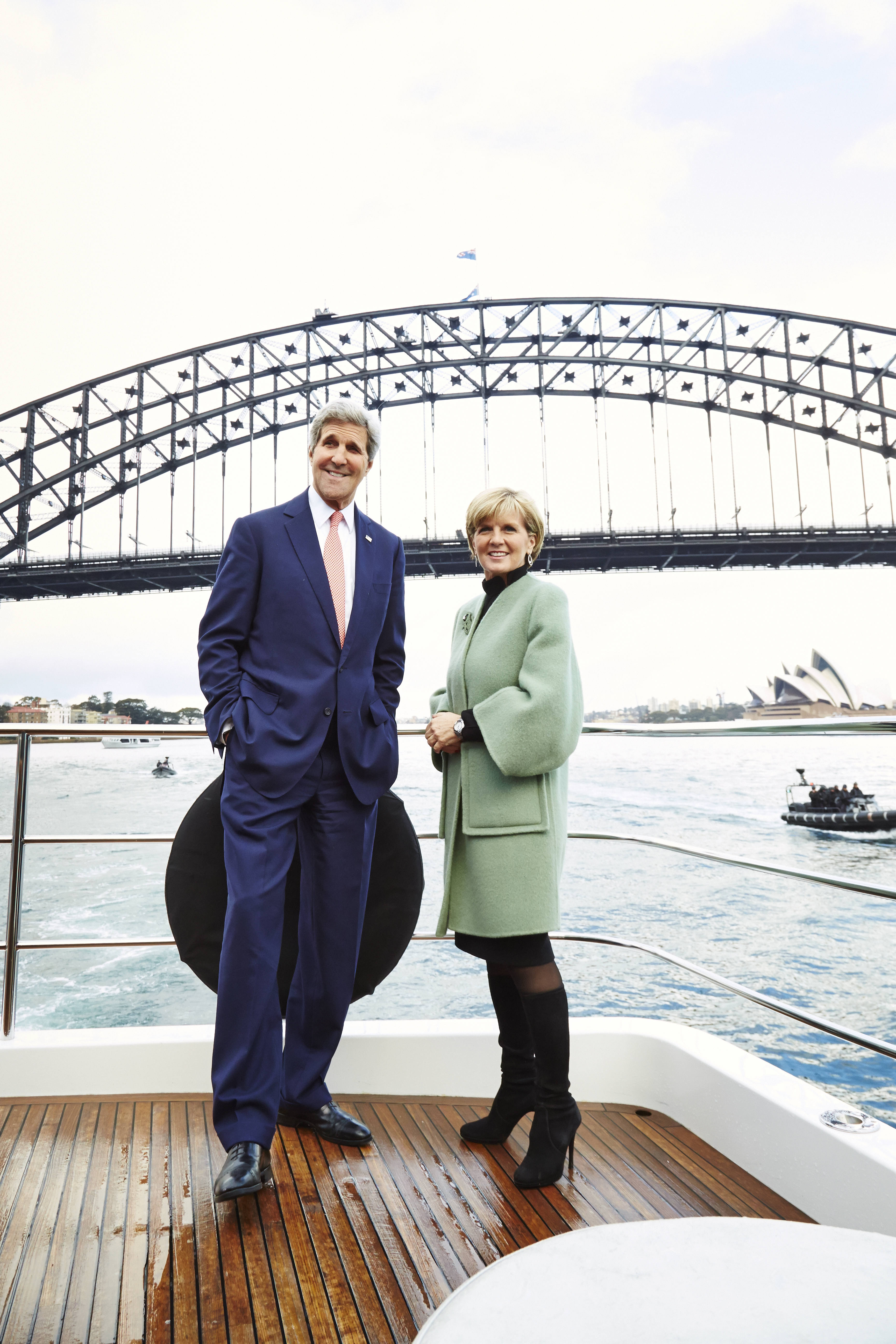 Minister for Foreign Affairs, Julie Bishop and United States Secretary of State, John Kerry travelling to the opening of the Australia-United States Ministerial Consultations (AUSMIN) 2014 at Admiralty House in Sydney. 12 August 2014.