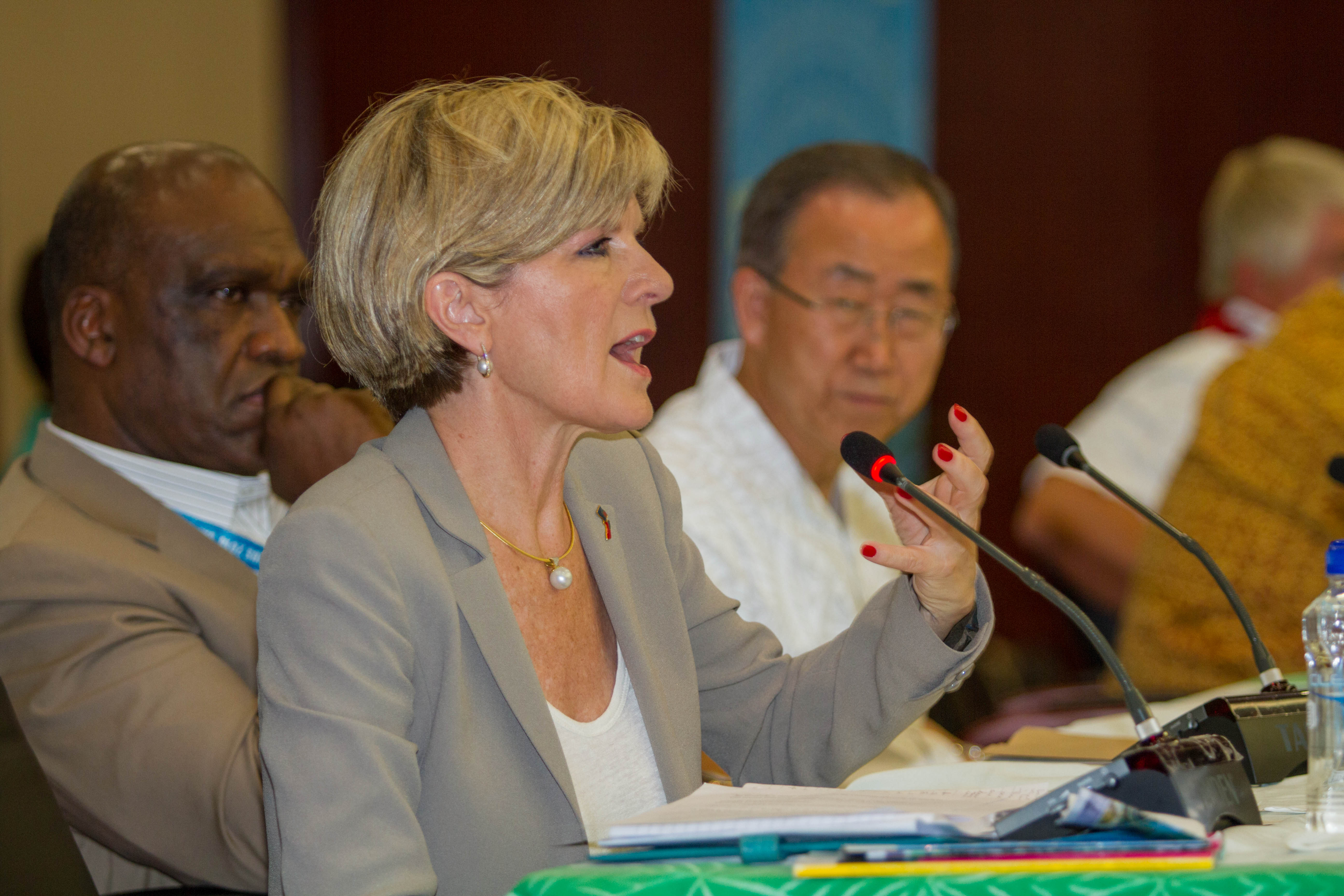 UN Secretary General Ban-ki Moon and UN John Ashe look on as Australia's Foreign Minister Julie Bishop speaks at SIDS 2014.