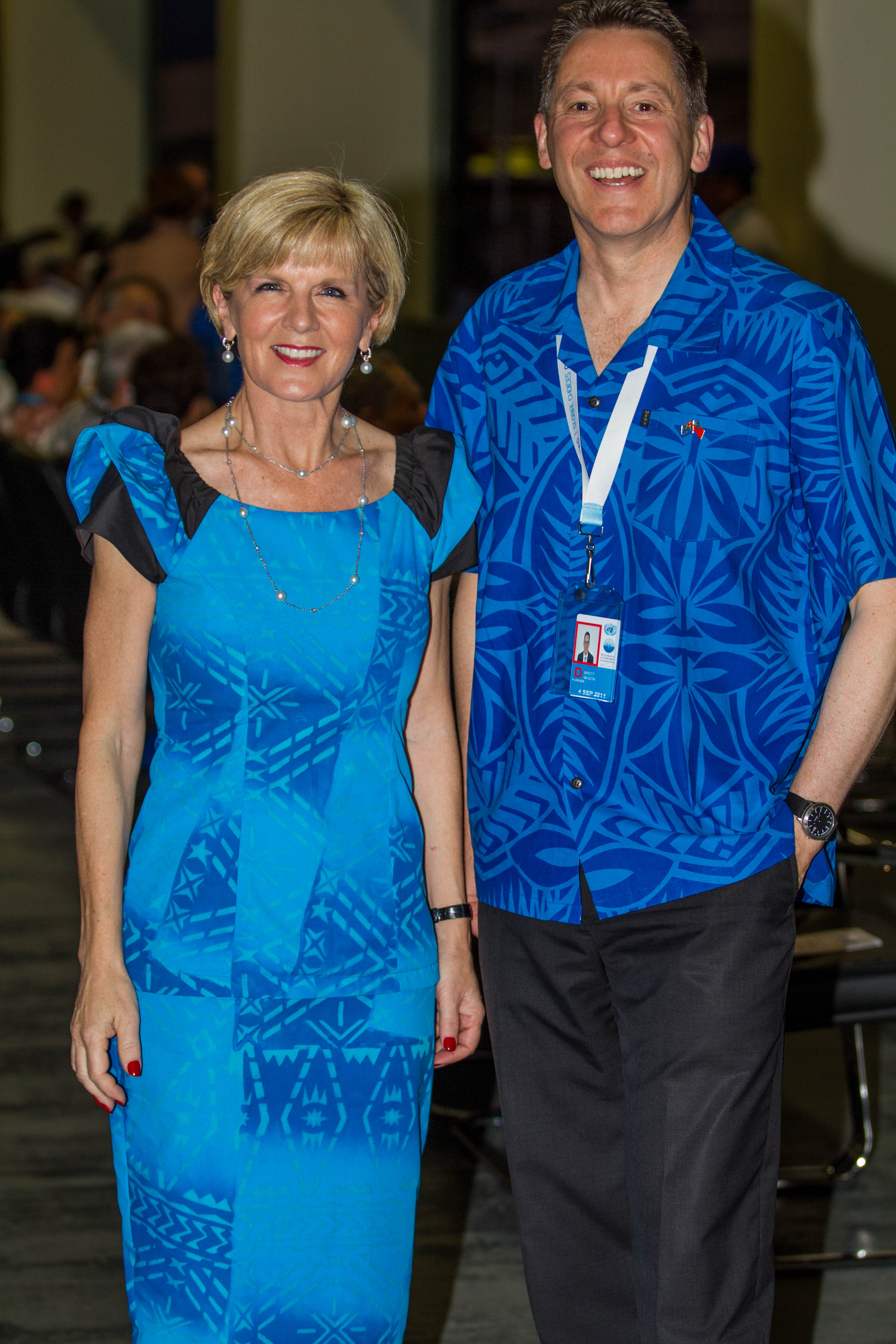 Foreign Minister Julie Bishop with Parliamentary Secretary Senator Brett Mason in traditional Samoan puletasi dress.