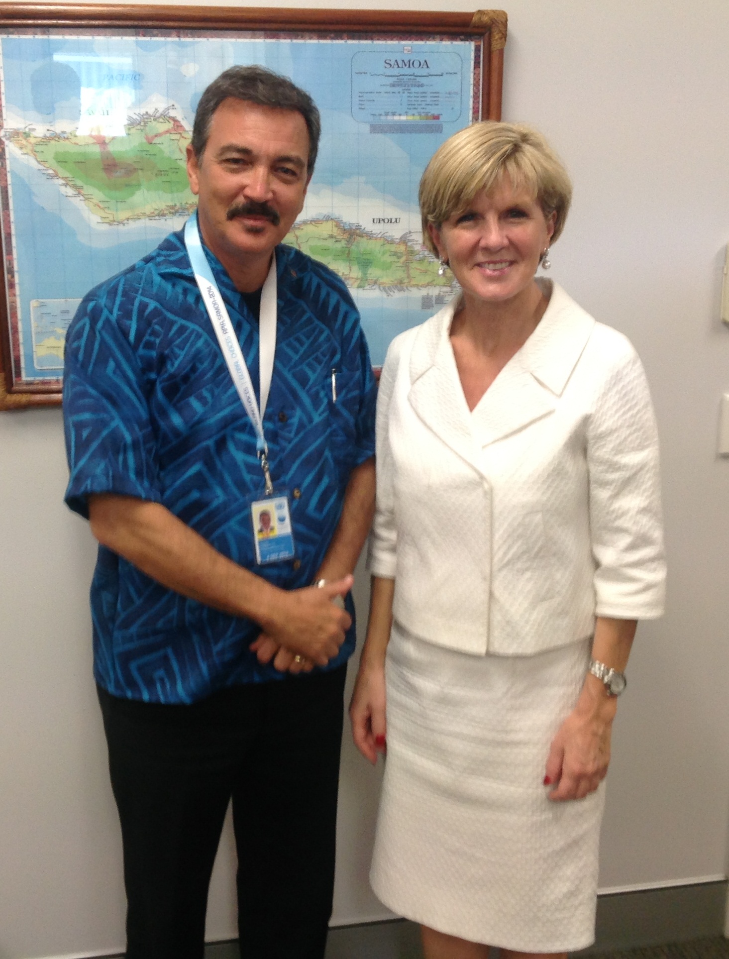 Foreign Minister Julie Bishop discusses common approaches to sustainable economic development with Antigua Foreign Minister Charles Fernandez at SIDS 2014 Conference. 1 September 2014.