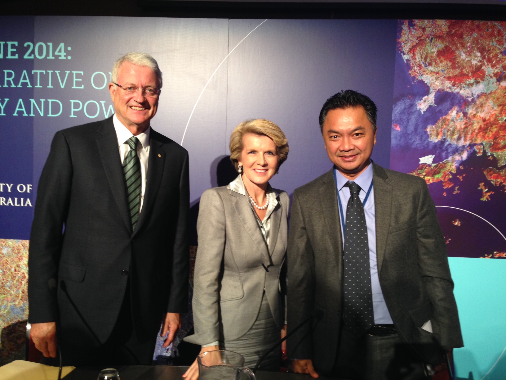 Foreign Minister Julie Bishop at the In the Zone panel discussion with UWA Chancellor Michael Chaney and Dr Dino Patti Djalal, former Indonesian Ambassador to the US.