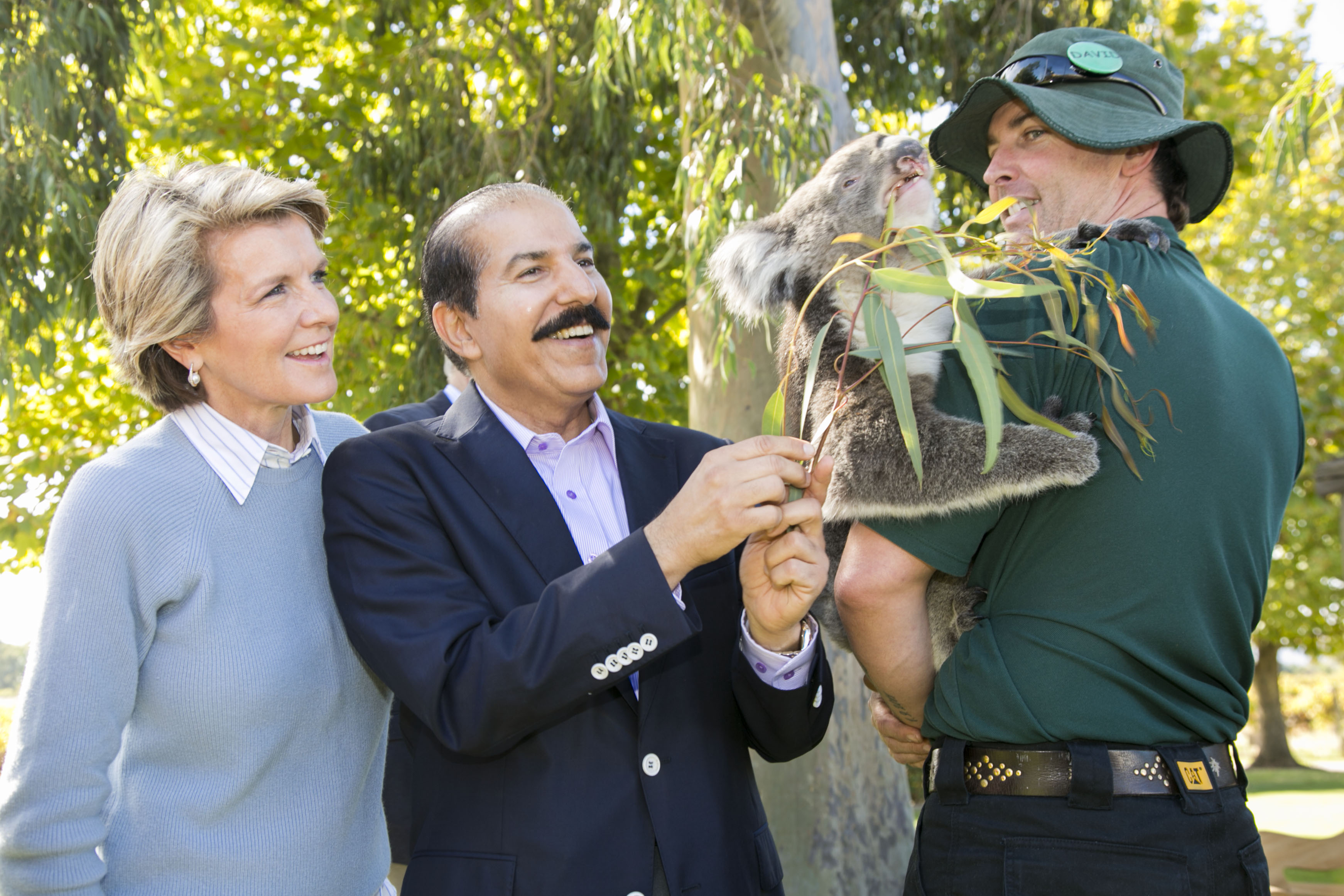 Foreign Minister Julie Bishop and Kuwait Ambassador Khaled Al-Shaibani feed a koala at Sandalford Winery.