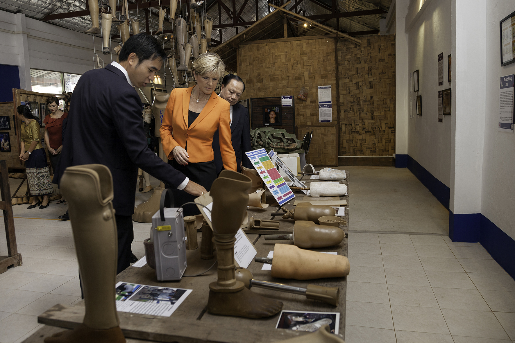 Foreign Minister Julie Bishop visits the UXO Visitor Centre of the Cooperative Orthotic and Prosthetic Enterprise (COPE). Photo: Bart Verweij