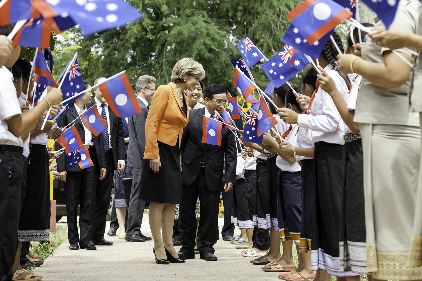 Foreign Minister Julie Bishop is greeted by students at Hom Neua Primary School. Photo: Bart Verweij
