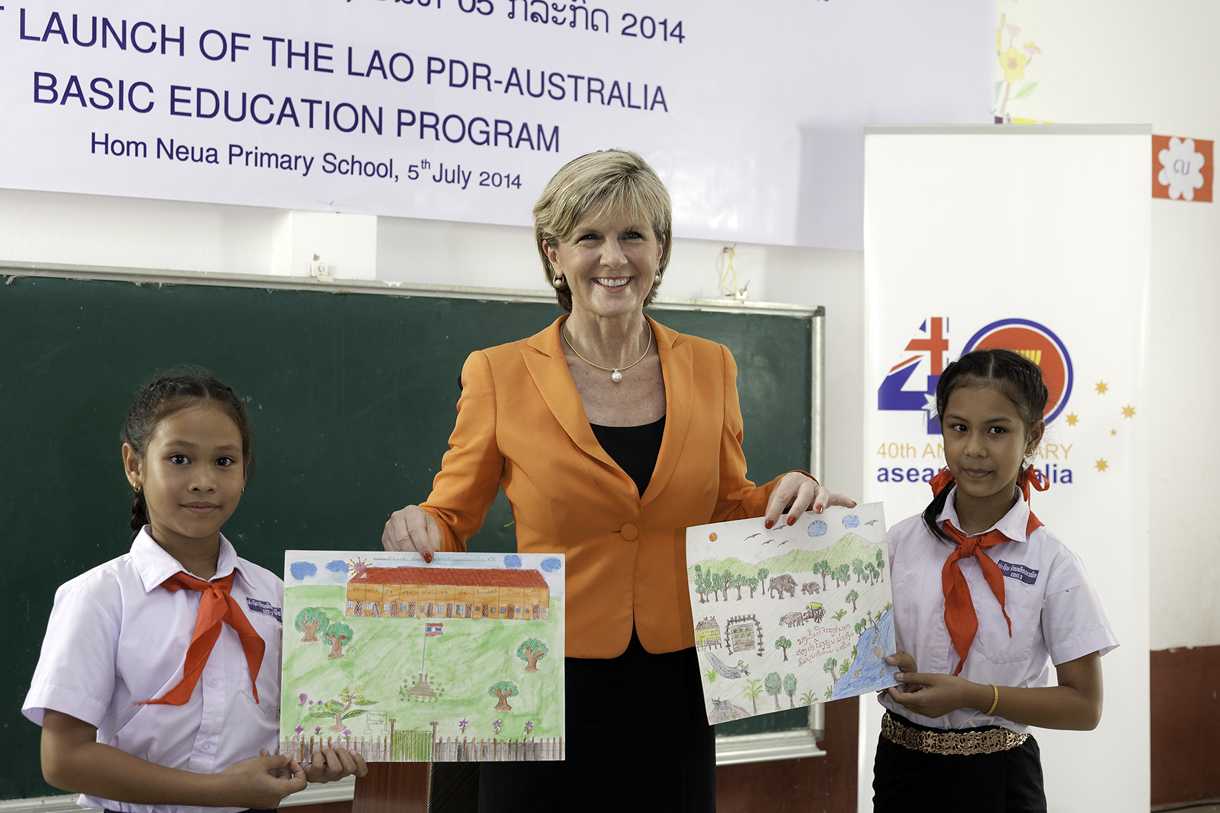 Foreign Minister Julie Bishop exchanges gifts at the joint launch of the new Australian basic education program. Photo: Bart Verweij