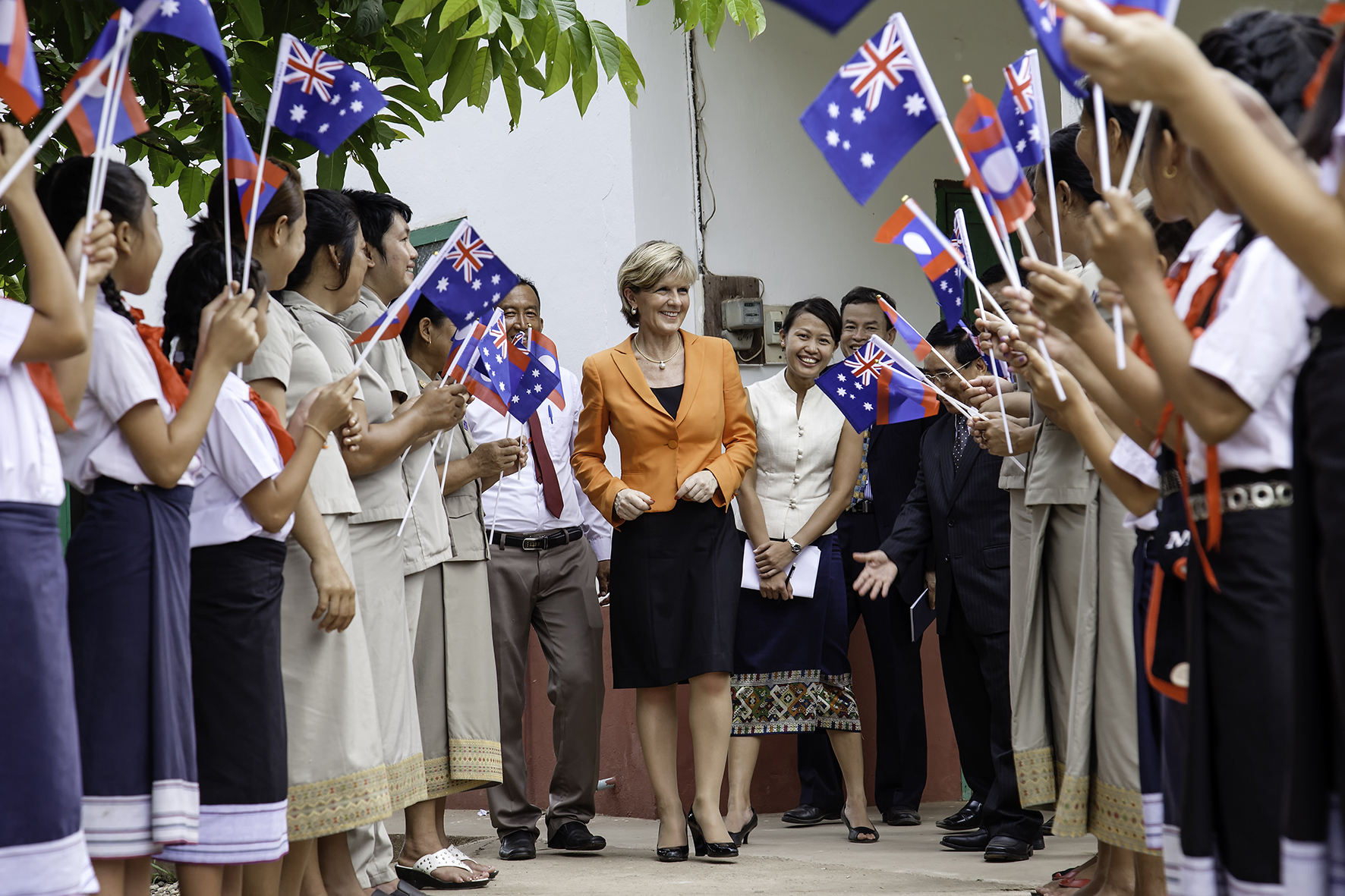 Foreign Minister Julie Bishop with H.E. Dr. Phankham Viphavanh, Lao minister of Education and Sports leaving Hom Neua Primary School. Photo: Bart Verweij