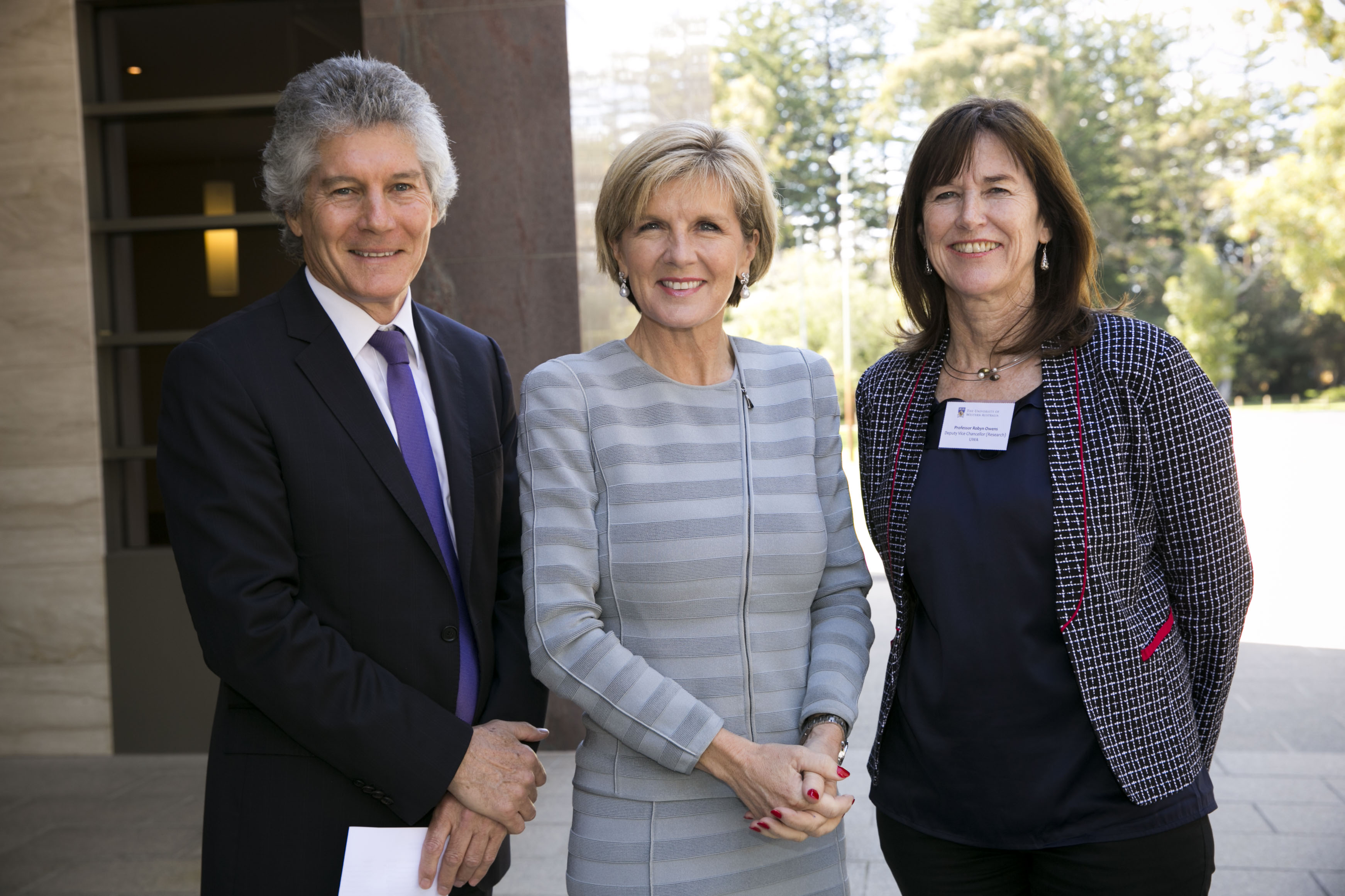 Foreign Minister Julie Bishop with Professor Robyn Owens, Deputy Vice-Chancellor (Research) and Winthrop Professor the Hon Stephen Smith, Director of the USAsian Centre, at the UWA Oceans Institute during IORA 2014.