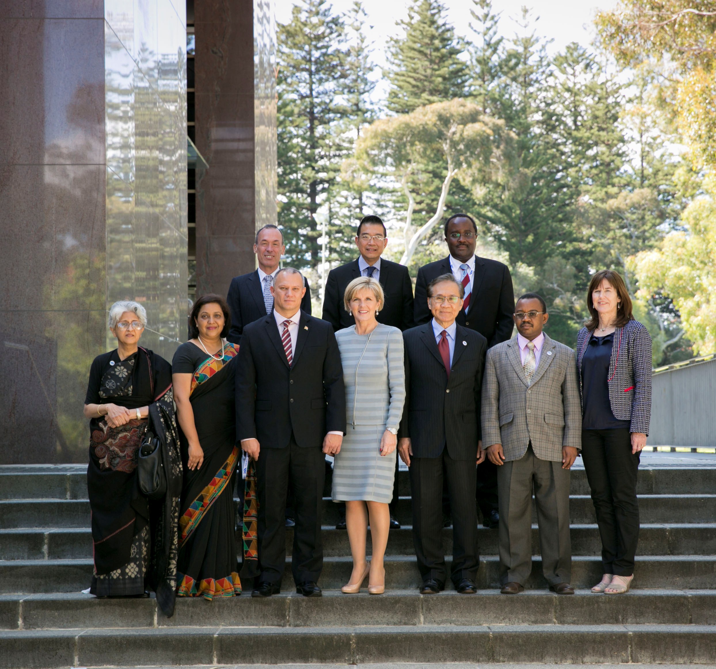 Foreign Minister Julie Bishop with Seychelles Foreign Minister, Mr Jean-Paul Adam (left) , Mr Don Pramudwinai, Thailand Deputy Foreign Minister (right) and Dr Mahadhi J Maalim, Tanzania Deputy Minister of Foreign Affairs and International Cooperation (second right) and other senior officials at the UWA Oceans Institute during IORA 2014.