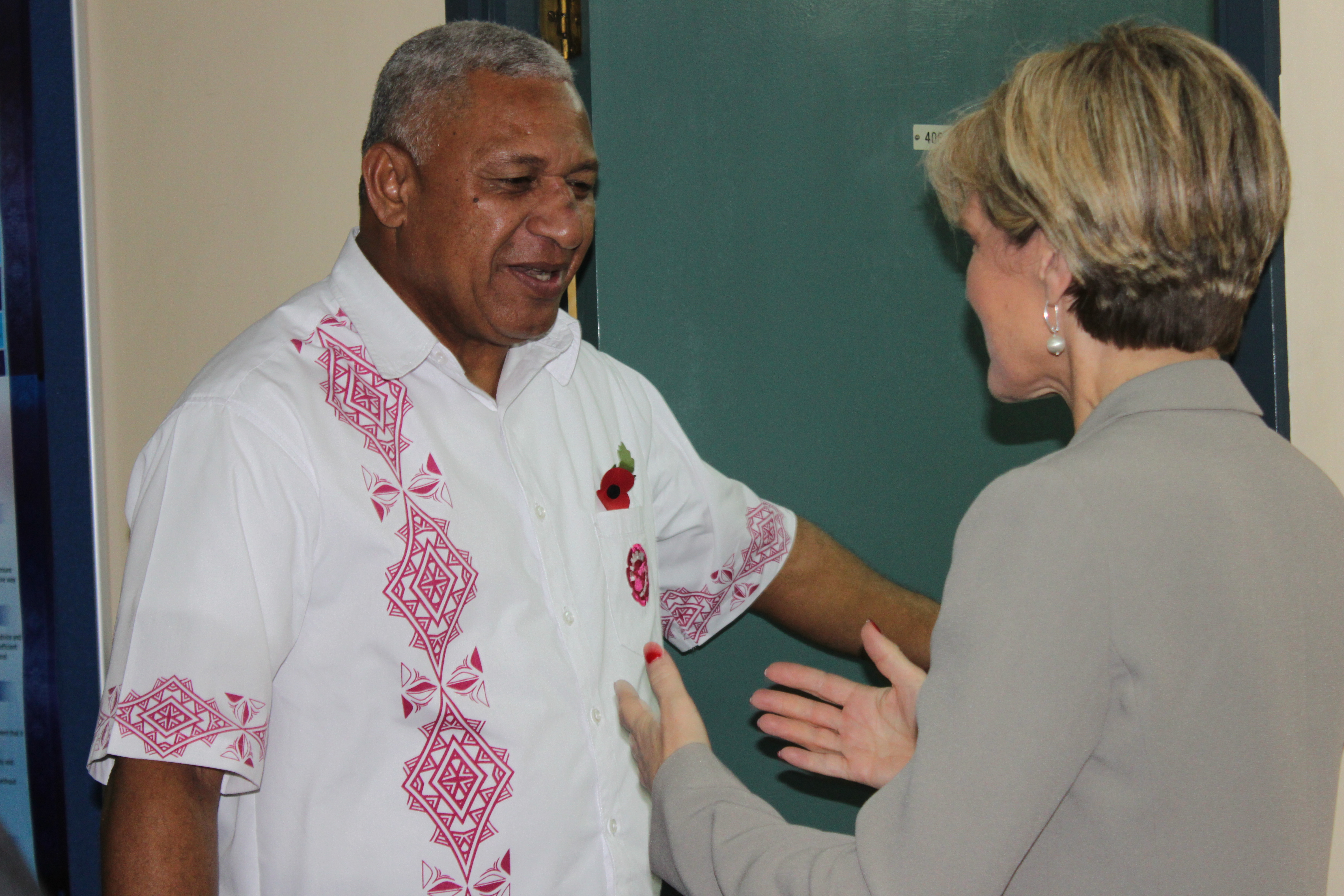 Foreign Minister Julie Bishop is warmly greeted by Fijian Prime Minister the Hon Rear Admiral (Ret.) Josaia Voreqe Bainimarama MP, Suva. 31 October.