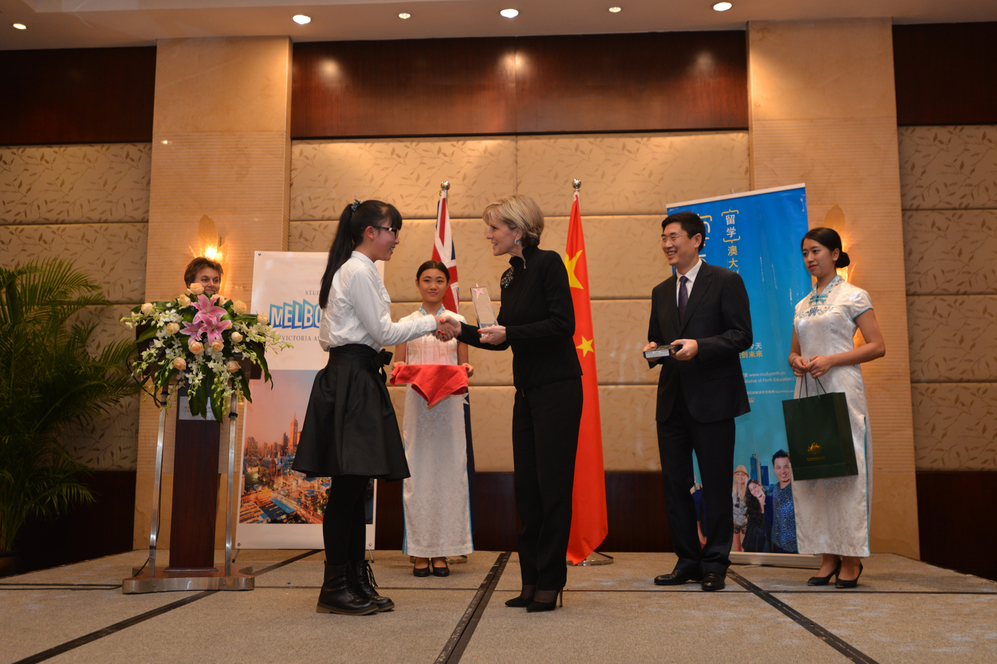 Foreign Minister Julie Bishop presents the award to a winner of Panda-Koala English Speech Competition in Chengdu