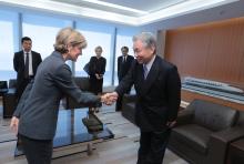 The Hon Julie Bishop MP, Minister for Foreign Affairs, greeted by Lieutenant General Nakashima, Commander Air Defence Command, and Mr Wakamiya, Parliamentary Vice Minister of Defense greeting HE Mr Bruce Miller, Australian Ambassador to Japan on arrival to Japan Air Self Defence Force Air Defence Command, Yokota Airforce Base today.