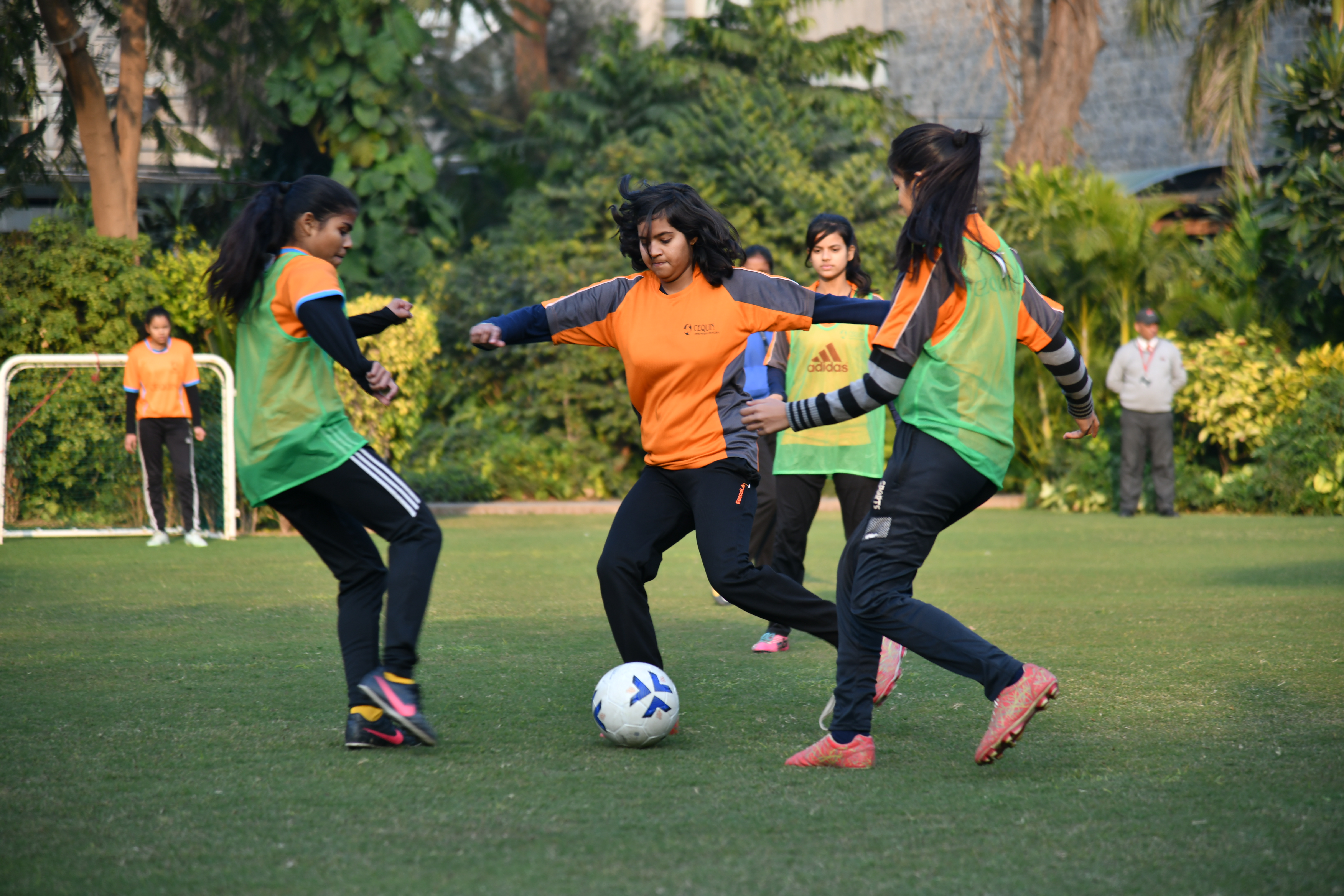 Young girls from local NGO CEQUIN playing a friendly football match at the Australian High Commission in New Delhi, credit:DFAT