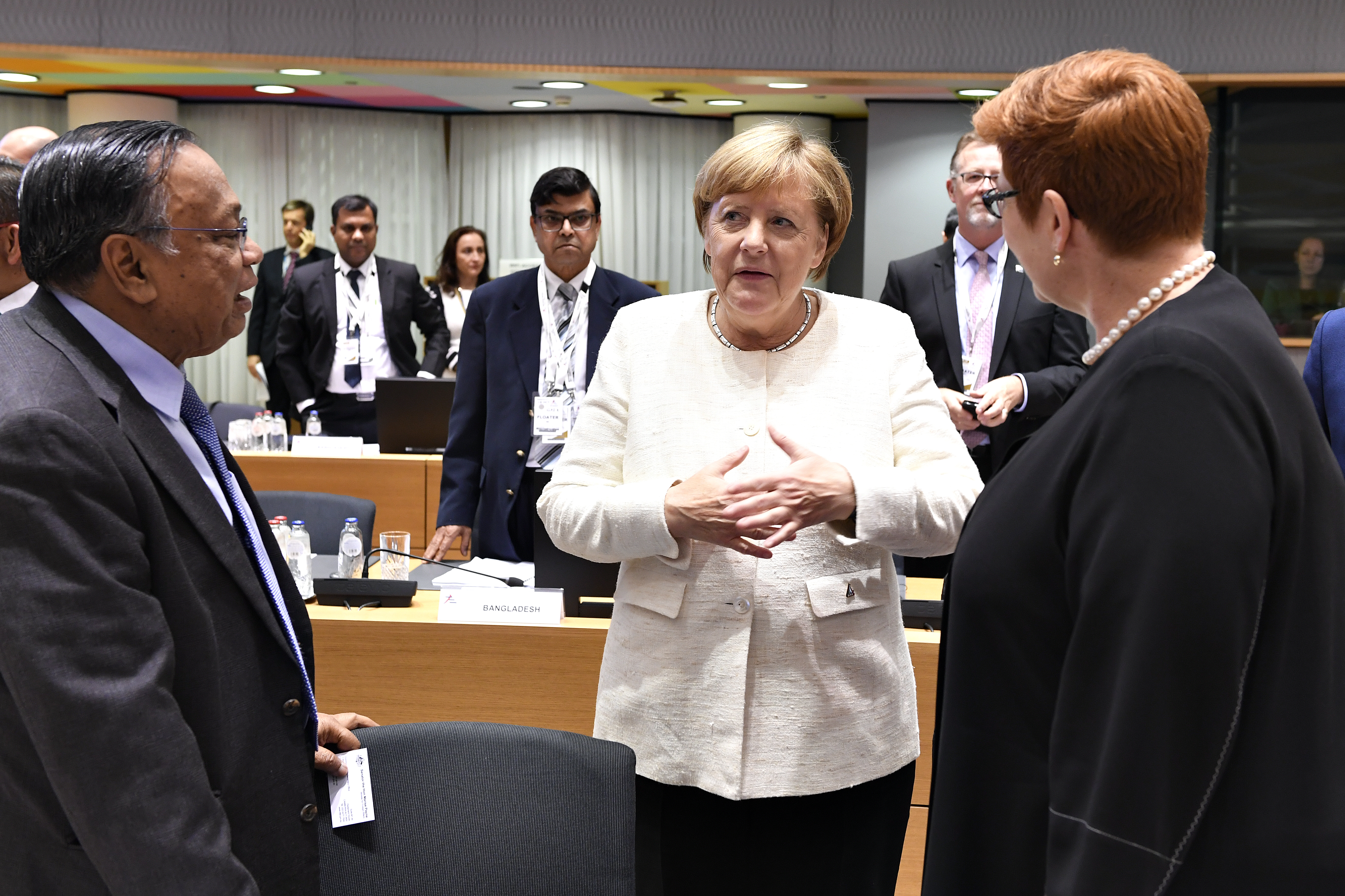Australian Minister for Foreign Affairs Senator Marise Payne in discussion with German Chancellor Angela Merkel and Bangladeshi Minister for Foreign Affairs Abdul Hassan Mahmood Ali at the Opening Ceremony of the Asia-Europe Meeting in Brussels. Photo credit: DFAT/Frederic Guerdin.