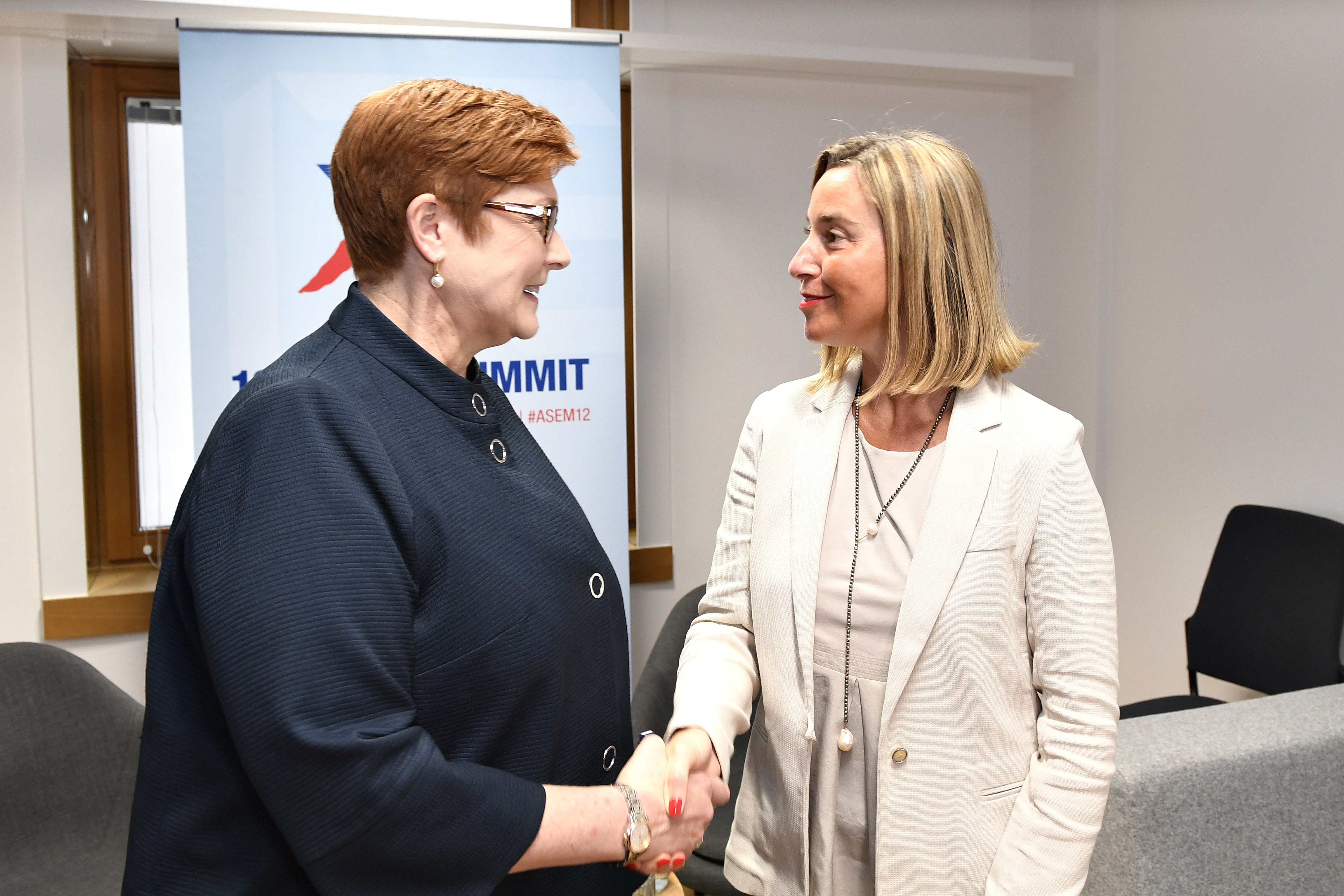 Australian Minister for Foreign Affairs Senator Marise Payne meeting High Representative of the European Union for Foreign Affairs and Security Policy at the Asia-Europe Meeting in Brussels. Photo credit: DFAT/Frederic Guerdin.