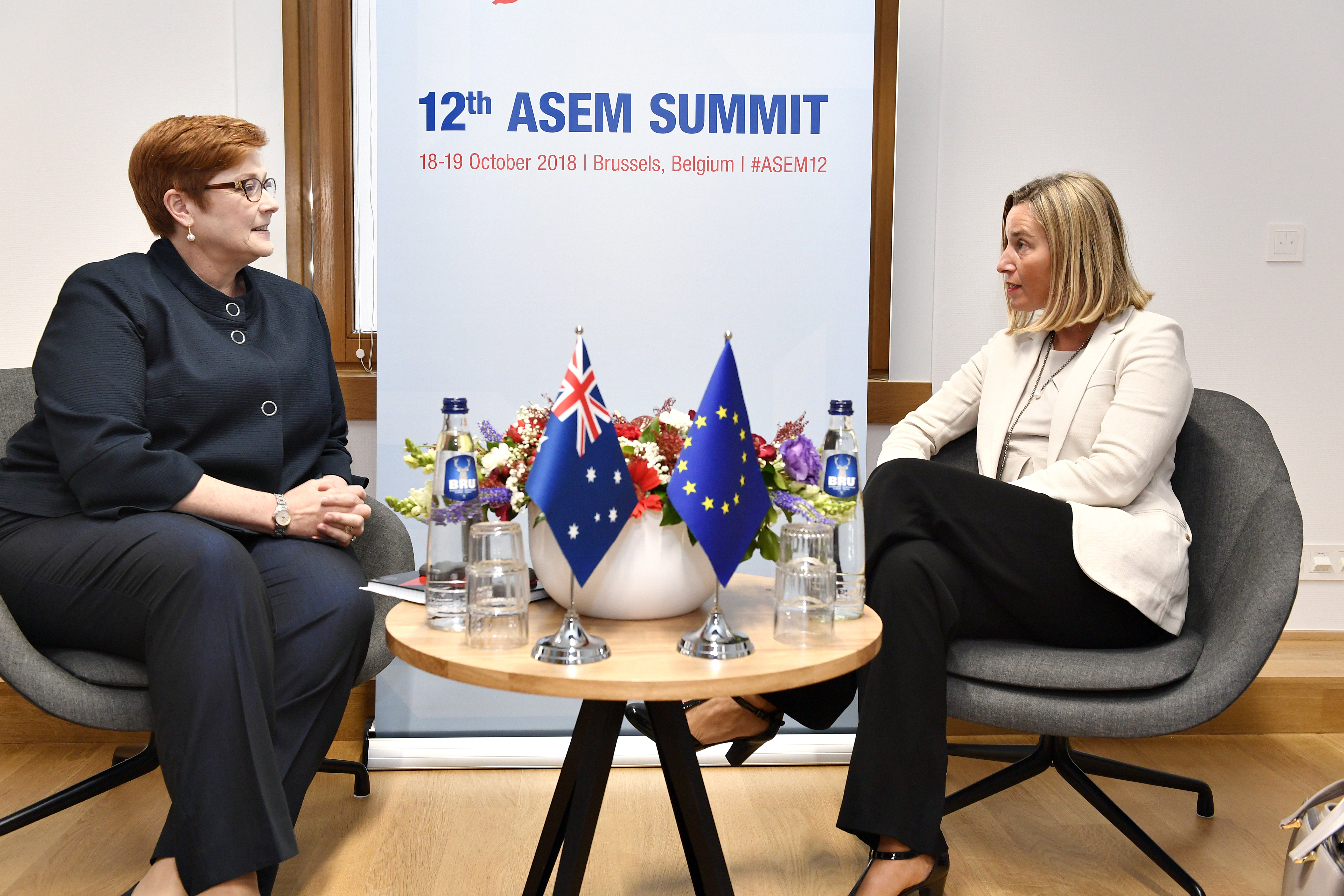 Australian Minister for Foreign Affairs Senator Marise Payne meeting High Representative of the European Union for Foreign Affairs and Security Policy at the Asia-Europe Meeting in Brussels. Photo credit: DFAT/Frederic Guerdin.