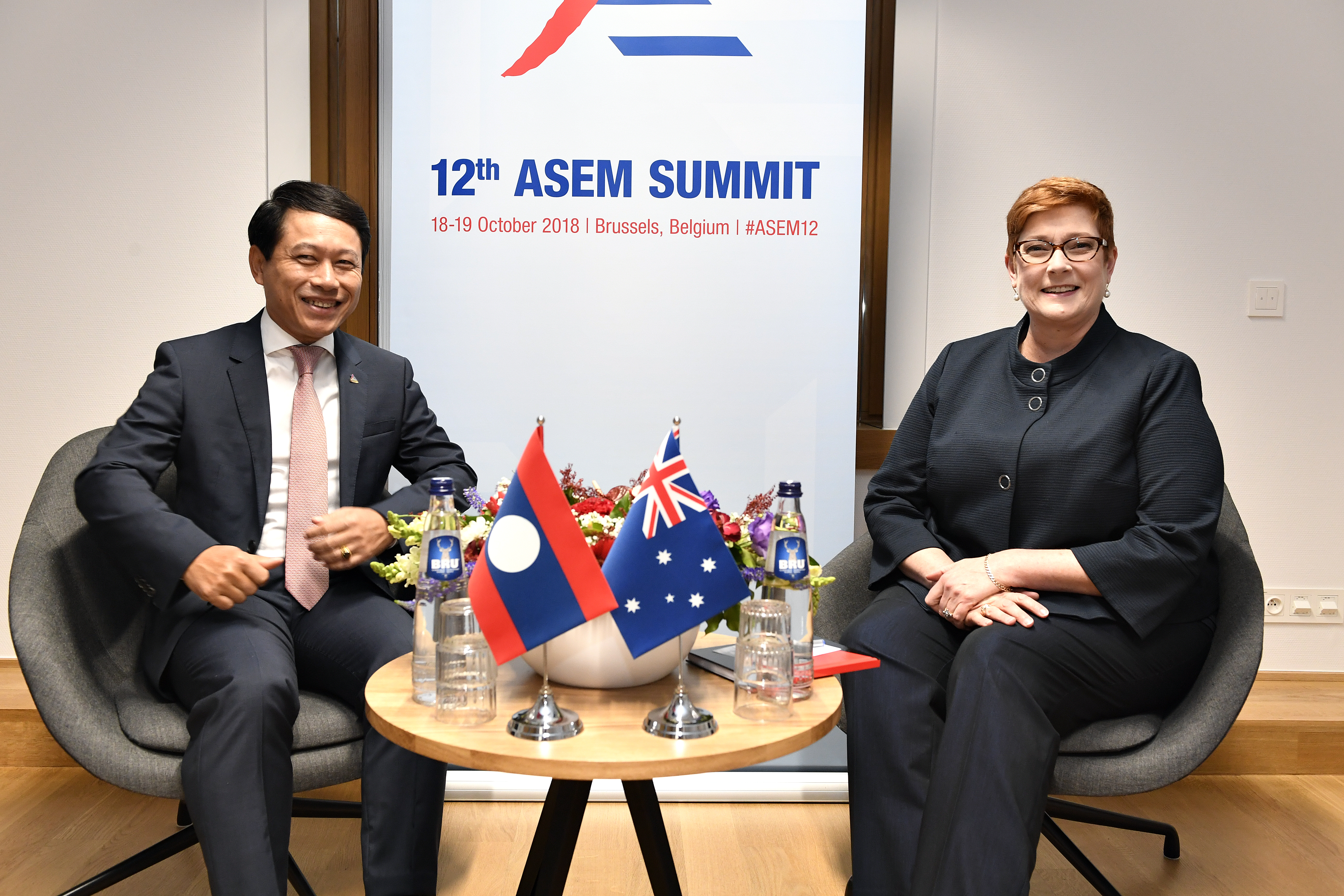 Australian Minister for Foreign Affairs Senator Marise Payne meets Laos Minister of Foreign Affairs Saleumxay Kommasith At the ASEM Summit in Brussels. Photo credit: DFAT/Frederic Guerdin.