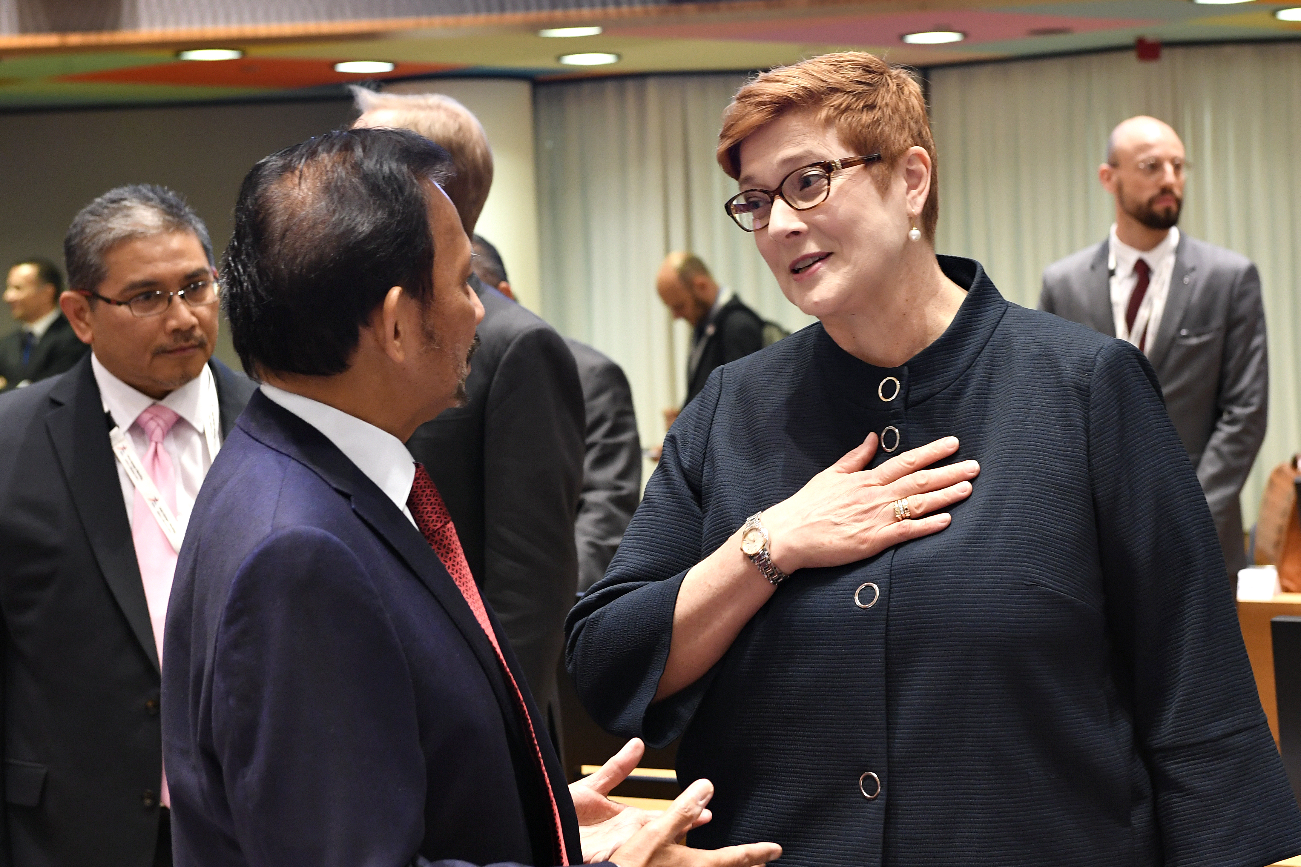 Australian Minister for Foreign Affairs Senator Marise Payne talking to His Majesty Sultan Haji Hassanal Bolkiah of Brunei at the Asia-Europe Meeting in Brussels. Photo credit: DFAT/Frederic Guerdin.