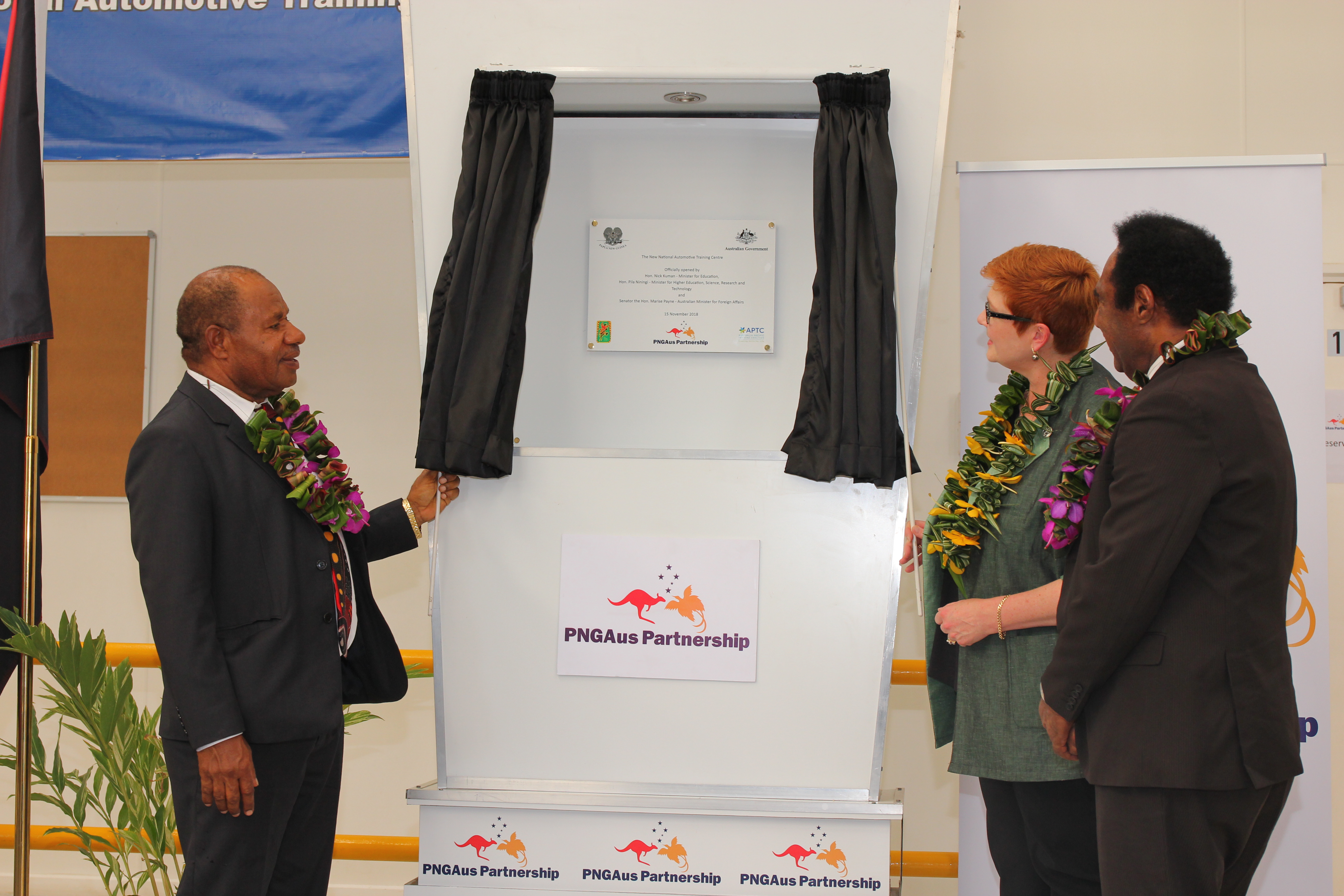 Foreign Minister Marise Payne with (R-L) Hon Pila Niningi, PNG’s Minister for Higher Education, Research, Science and Technology, and Hon Nick Kuman, PNG’s Minister for Education, unveiling the plaque at the launch of the new National Automotive Training Centre in Port Moresby. Photo credit: DFAT.