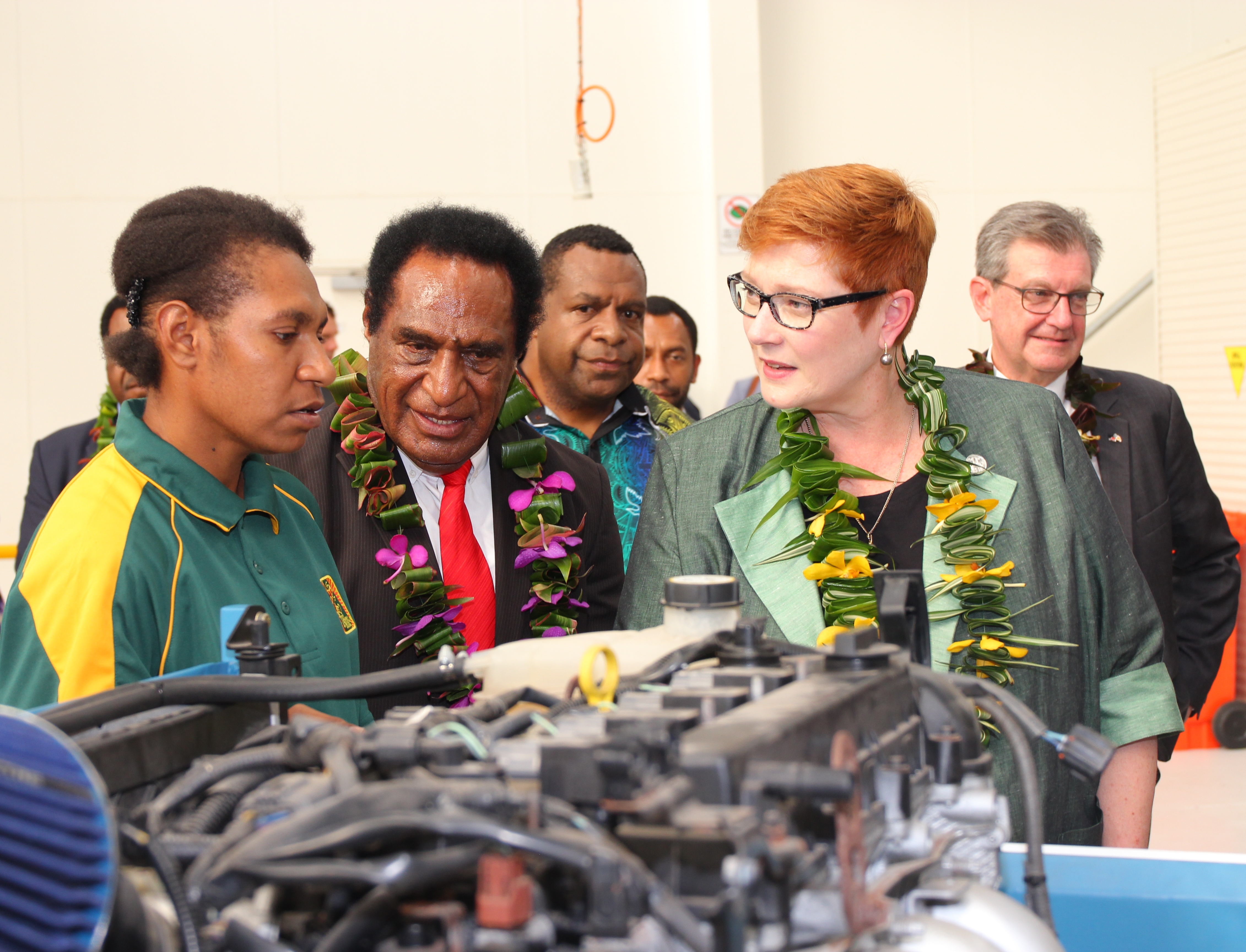 Foreign Minister Marise Payne with Hon Pila Niningi, PNG’s Minister for Higher Education, Research, Science and Technology, talking with students at the launch of the new National Automotive Training Centre in Port Moresby. Photo credit: DFAT.