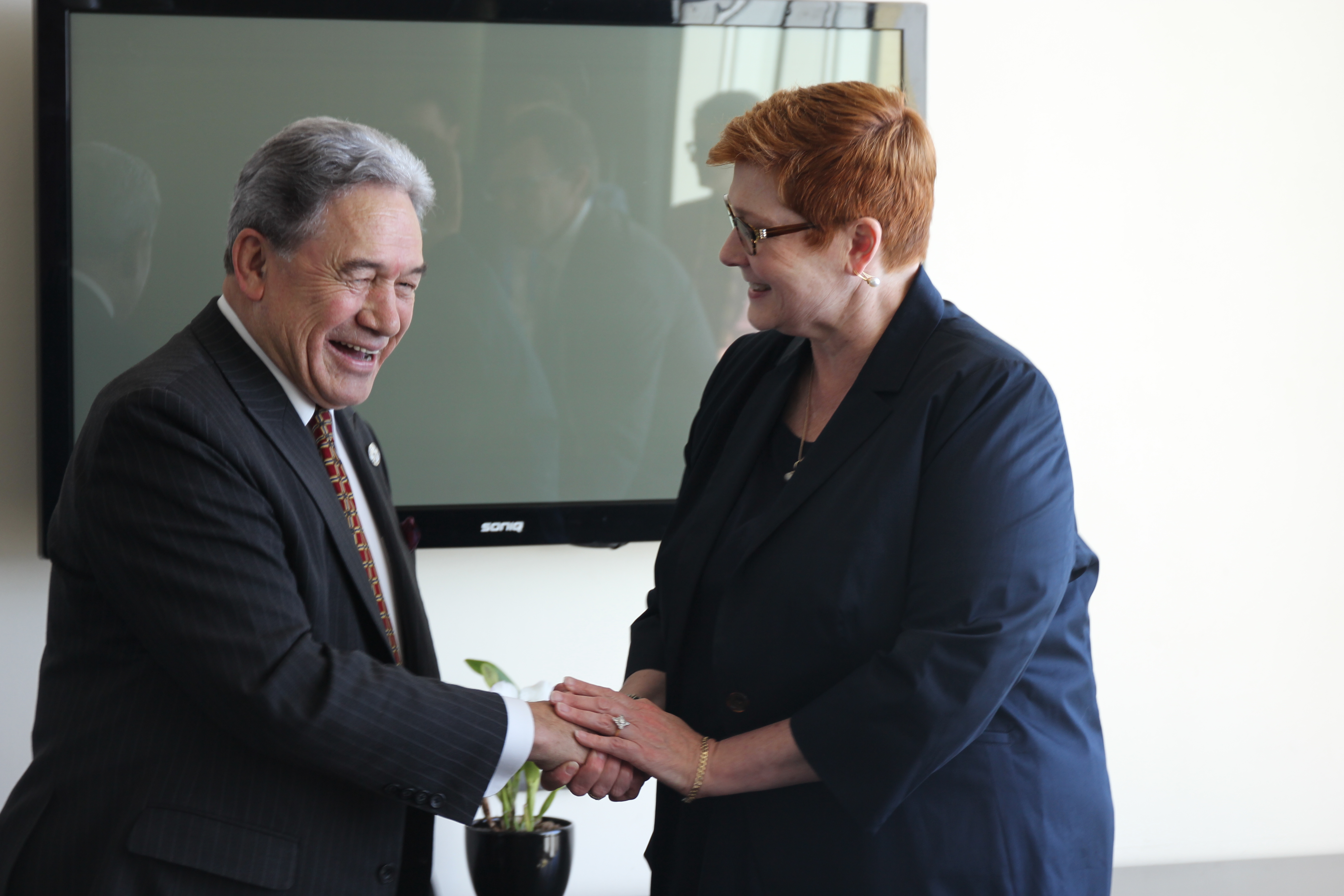 Foreign Minister Marise Payne welcoming New Zealand Minister of Foreign Affairs Winston Peters in Port Moresby ahead of a bilateral meeting. Photo credit: DFAT.