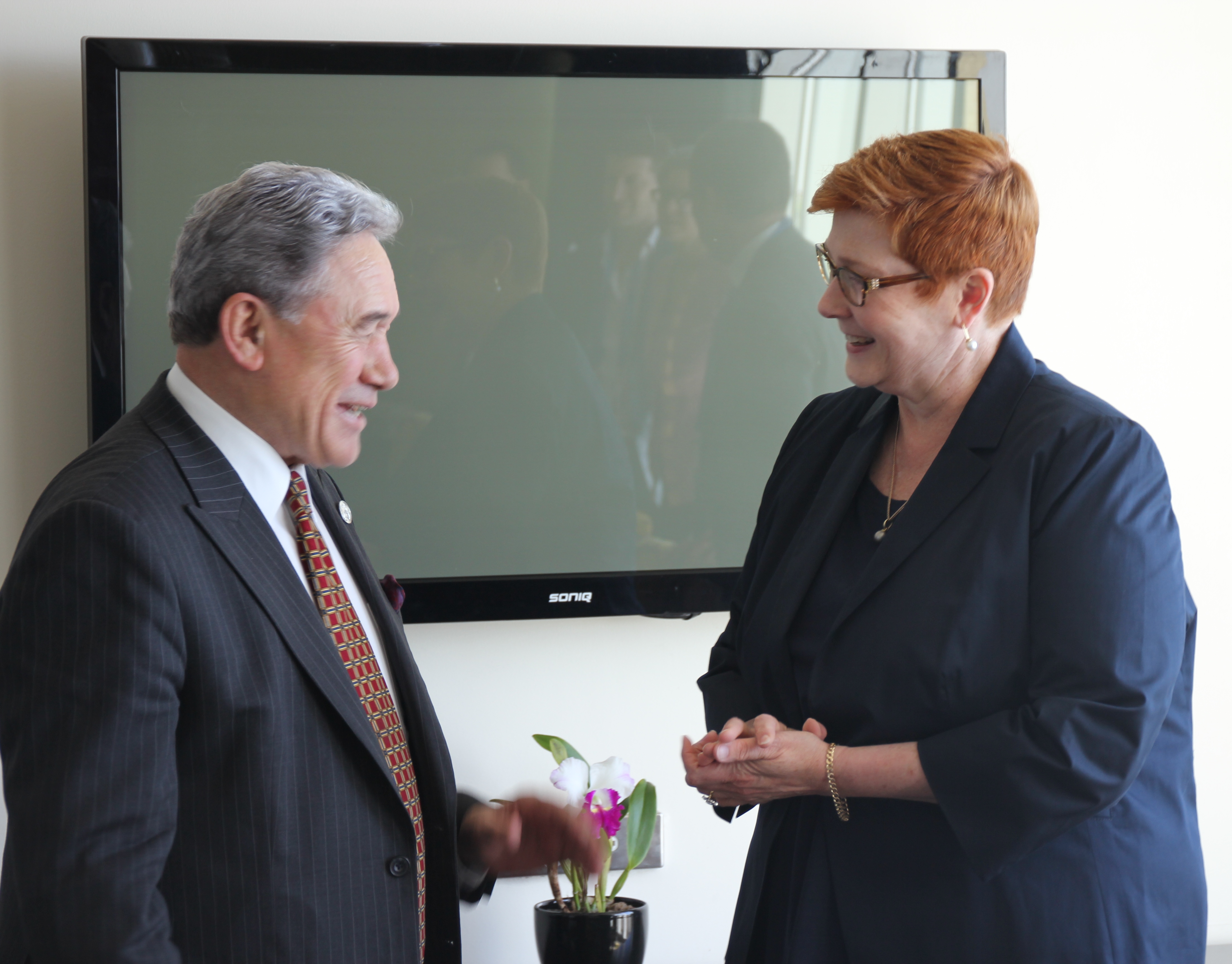 Foreign Minister Marise Payne welcoming New Zealand Minister of Foreign Affairs Winston Peters in Port Moresby ahead of a bilateral meeting. Photo credit: DFAT.