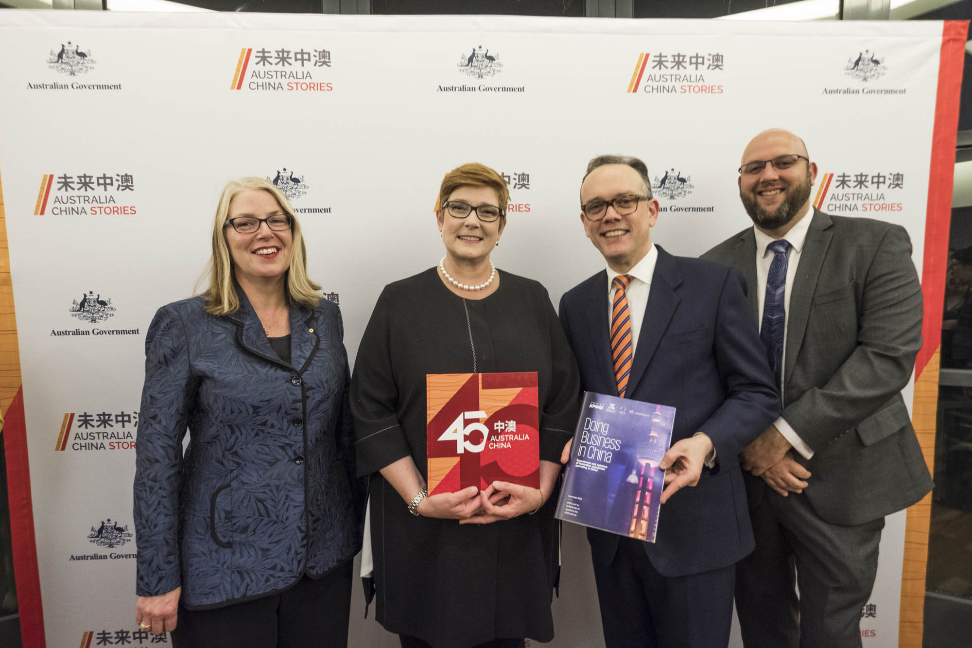 Minister for Foreign Affairs Marise Payne (centre) with L to R - Australian Ambassador to China Jan Adams, Vaughn Barber, Chair of AustCham Beijing and Nick Coyle, Executive Director & CEO of AustCham Beijing. Photo credit: DFAT/Chris Crerar.