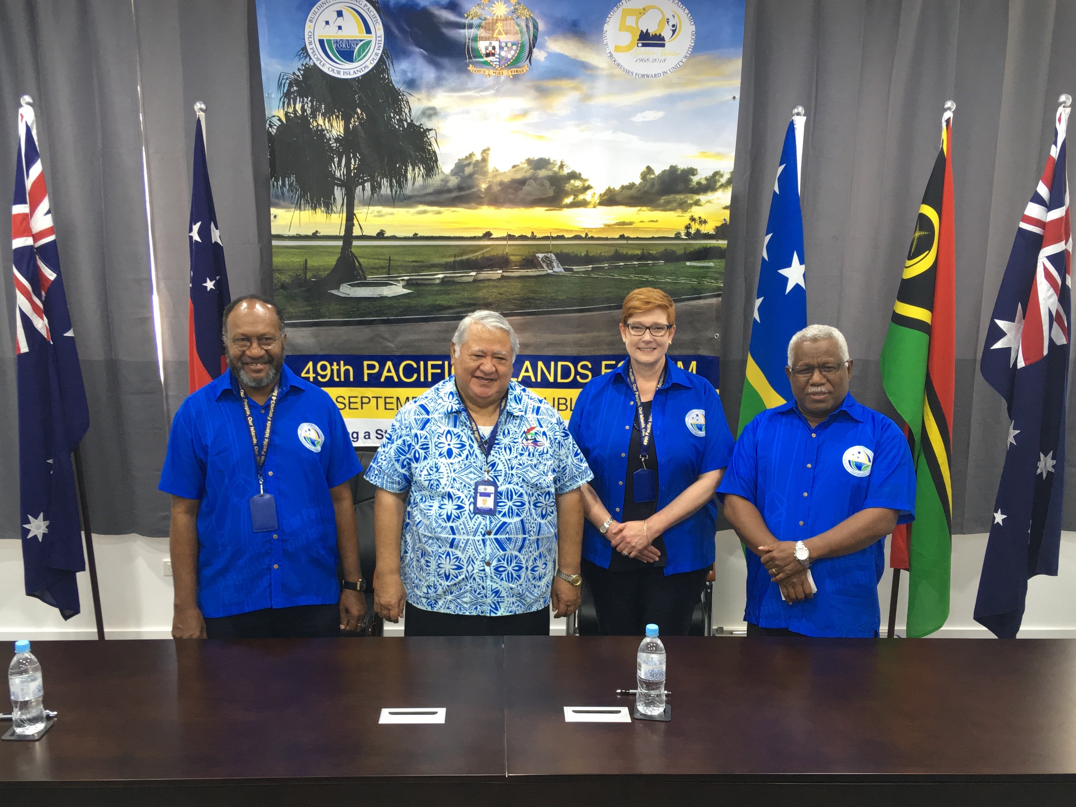 Group photo with the Prime Minister of Vanuatu, the Hon Charlot Salwai Tabimasmas, the Prime Minister of Samoa, the Hon Tuilaepa Sailele Malielegaoi, Australian Minister for Foreign Affairs, Senator the Hon Marise Payne, and the Prime Minister of Solomon Islands, the Hon Rick Houenipwela MP ahead of MoU signings to expand access to Australia’s Pacific Labour Scheme and Pacific Medicines Testing Program. Photo: Nicholas Flack / DFAT.