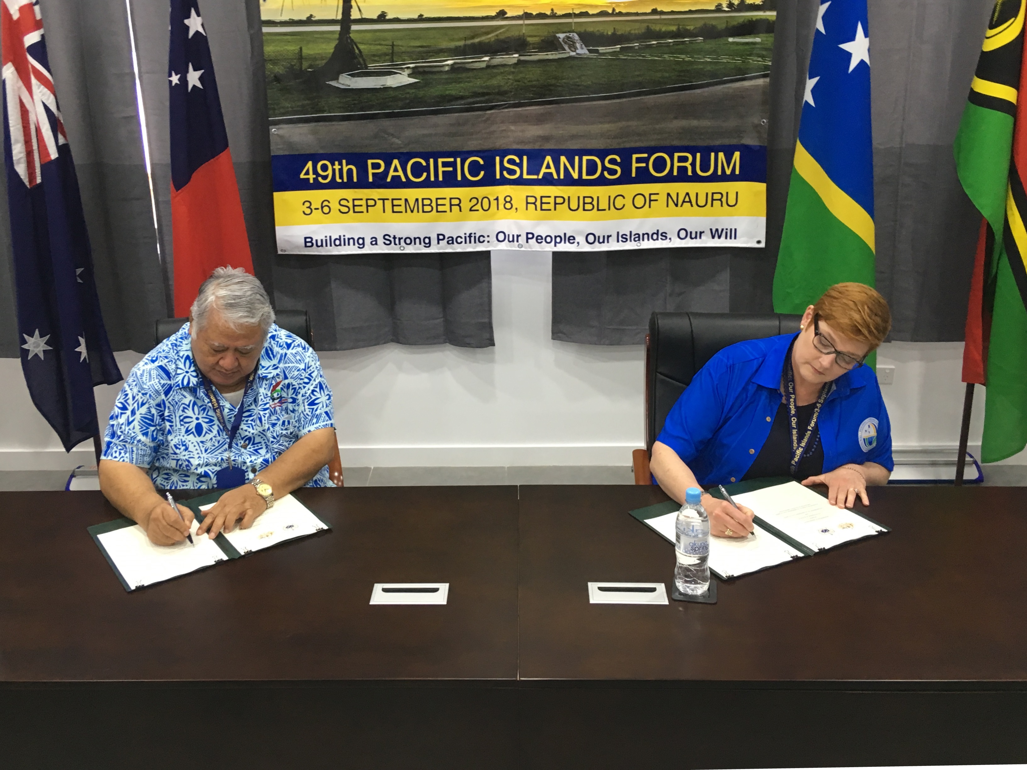 Australian Minister for Foreign Affairs, Senator the Hon Marise Payne, and the Prime Minister of Samoa, the Hon Tuilaepa Sailele Malielegaoi, sign two bilateral MoUs to grant Samoa access to Australia’s Pacific Labour Scheme and Pacific Medicines Testing Program. Photo: Nicholas Flack / DFAT.