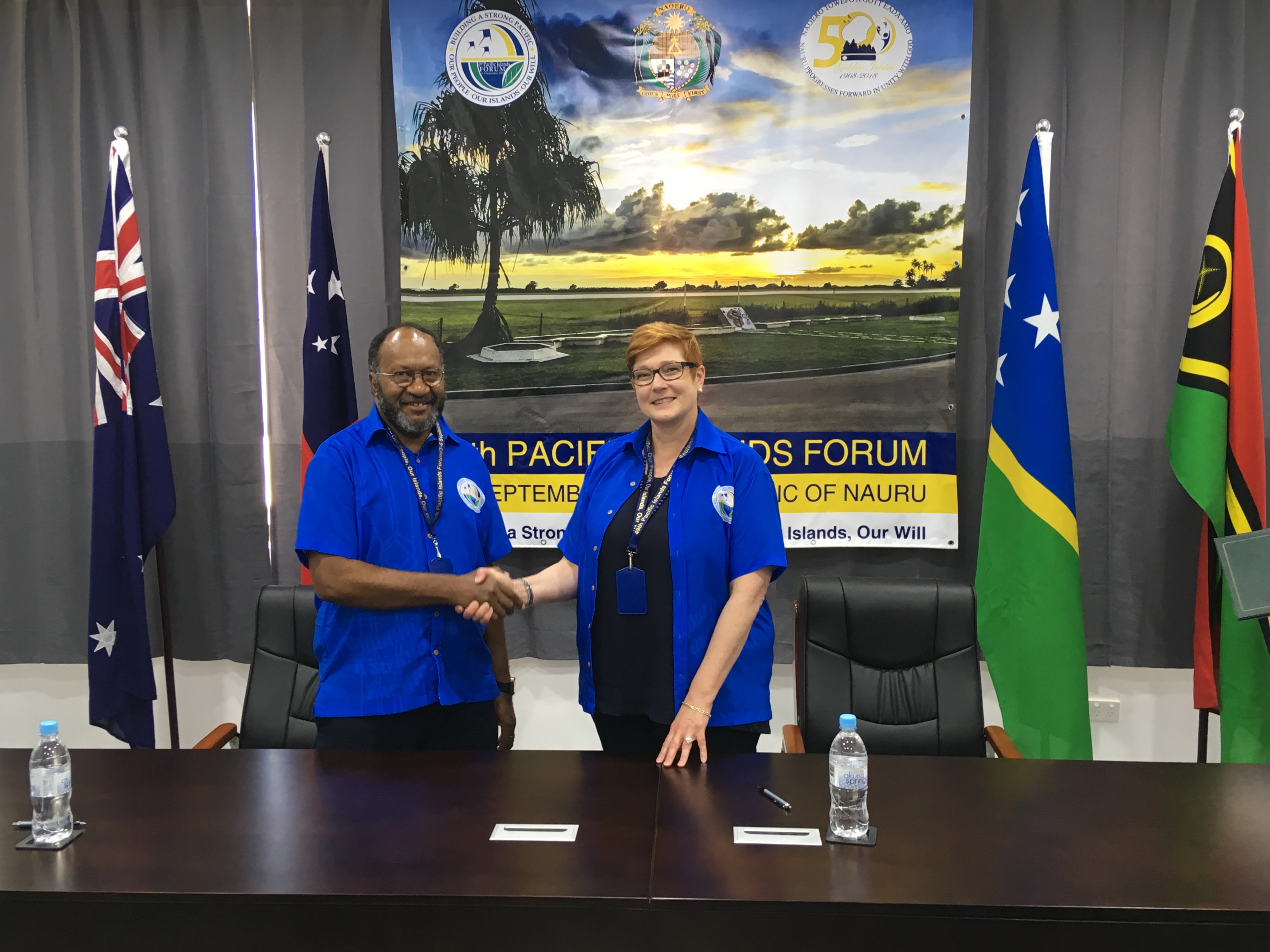 Australian Minister for Foreign Affairs, Senator the Hon Marise Payne, shaking hands with the Prime Minister of Vanuatu, the Hon Charlot Salwai Tabimasmas, following the signing of two bilateral MoUs to enable Vanuatu to participate in Australia’s Pacific Medicines Testing Program and Pacific Labour Scheme. Photo: Nicholas Flack / DFAT.