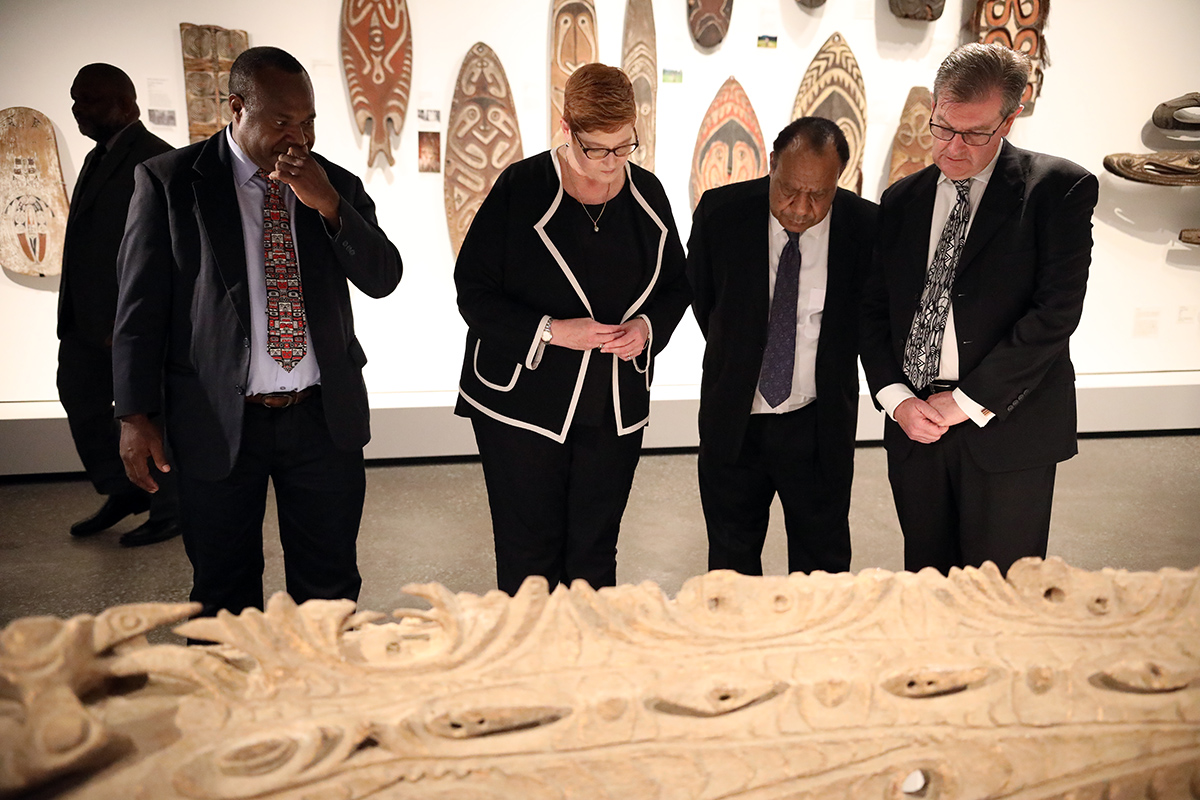Dr Andrew Moutu, Foreign Minister Marise Payne, Foreign Affairs Minister Rimbink Pato, and High Commissioner Bruce Davis touring the National Museum & Art Gallery. Photo credit: DFAT.
