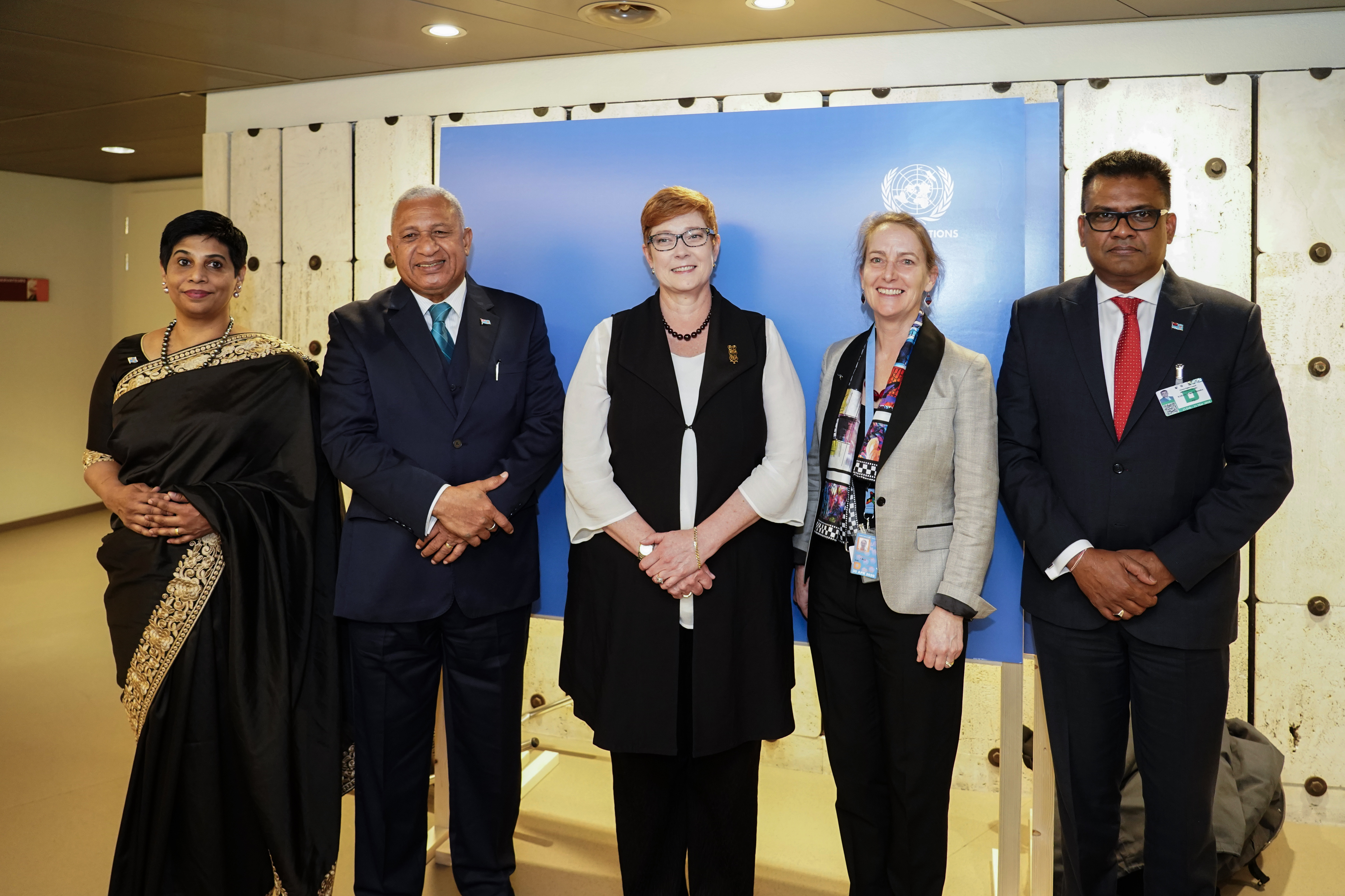 Foreign Minister Payne and Fijian Prime Minister Bainimarama at the Palais des Nations in Geneva during the 40th session of the UN Human Rights Council, 25 February 2019. Photo credit: DFAT/ Christian Bonzon